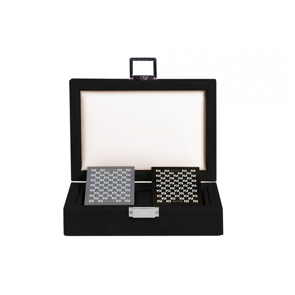 The cards box is the perfect accessory to display and store decks of cards. Entirely leather-wrapped, it fits on any shelf to brighten it up and to make the game more elegant.