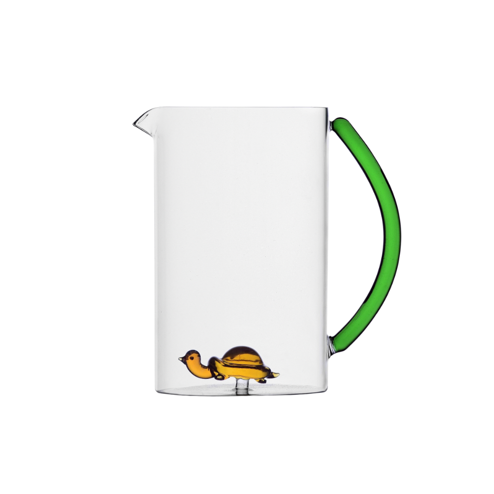 Crafted by skilled artisans, the Animal Farm collection presents a stunning pitcher featuring a majestic turtle embellishment. Created by designer Alessandra Baldereschi, this exquisite piece is meticulously handcrafted from the finest borosilicate glass and boasts a generous capacity of 49 oz. Elevate your table setting with this unique addition to your collection.