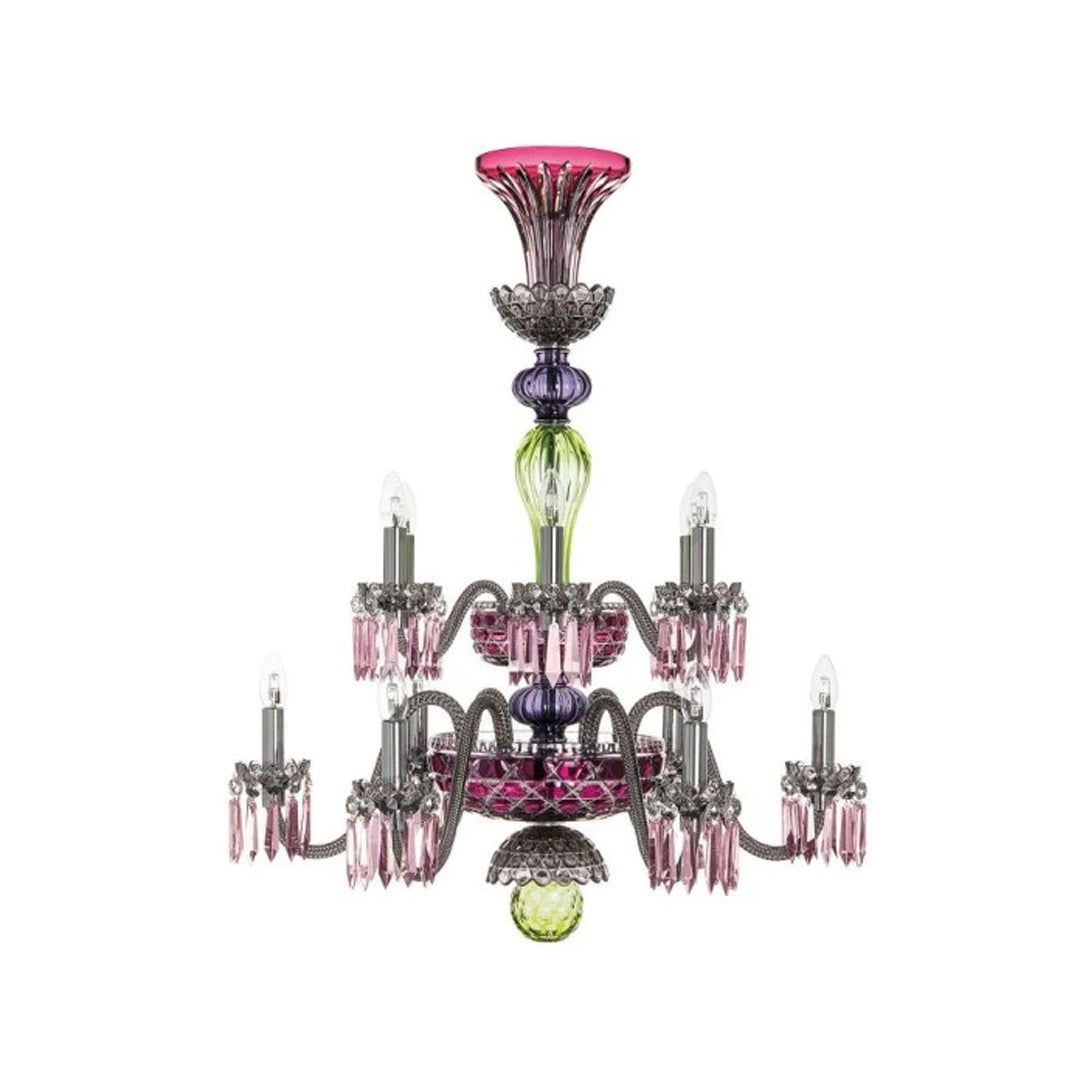 The Arlequin collection represents a stylish and lighthearted update of Saint-Louis’ timeless Classique line. Arlequin takes the opulence of Classique—with its lavish variety of shapes, forms and cuts—and gives it a fantastical twist of color. This combination of classic design and modern mischievousness, of refinement and boldness, creates a decorative mode that is truly new. 18 twisted hollow arms in flannel grey, clear crystal layered with amethyst diamond-cut crystal bowl, flannel grey diamond cut-crystal bowls, clear crystal layered with bevel-cut amethyst crystal vase, large Venetian-style chartreuse balusters, large Venetian style flannel middle ball, crystal clear layered with chartreuse crystal pearl-cut chandelier ball, flannel grey cups with amethyst facet-cut crystal pendants and crystal clear octagons.