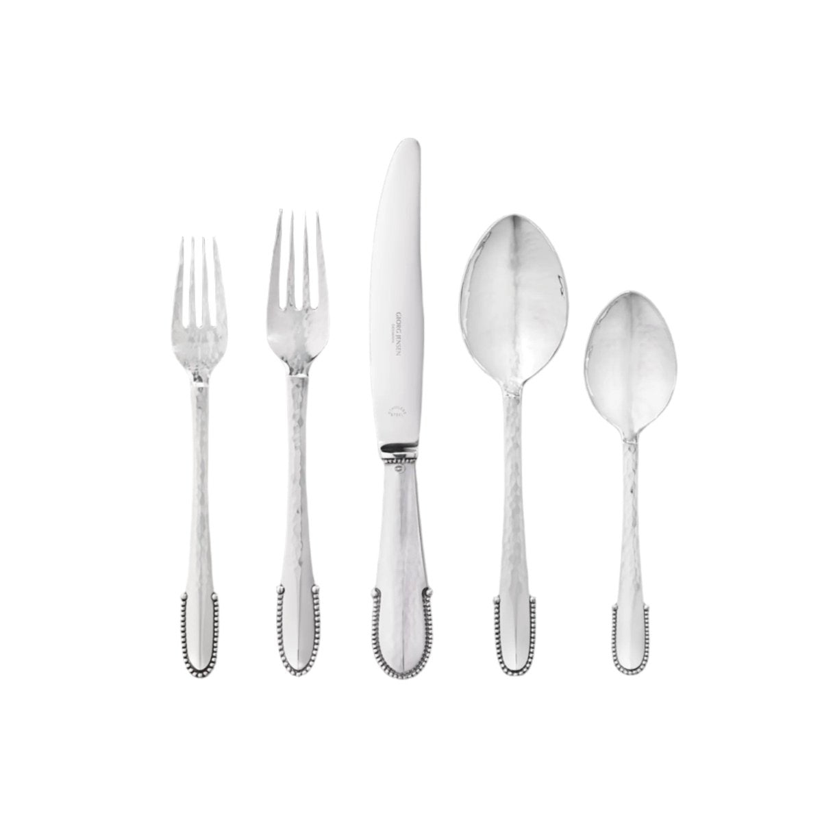 BEADED five piece place setting in sterling silver, designed by Georg Jensen in 1916. Introduce timeless elegance to your dining table with this exquisite sterling silver place setting, meticulously designed by renowned silversmith Georg Jensen in 1916.