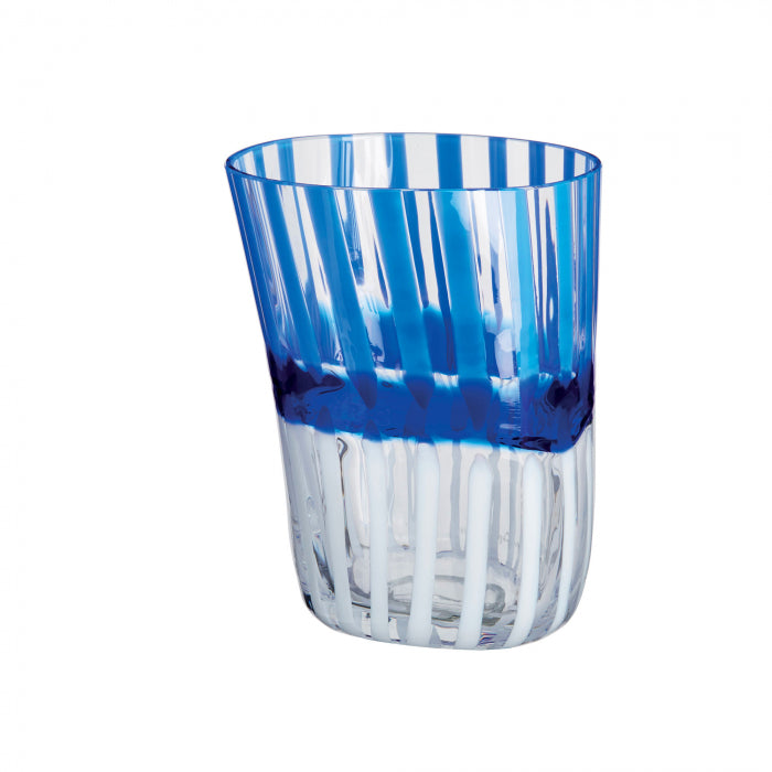 Glasses with an irregular oval section, inclined, in Murano Crystal, blown by mouth and hand-finished with different decorative motifs applied hot: murrina, little rods, festoons, speckles, streaks, colored rings and spirals, gold and silver leaves, transparent and opaque.