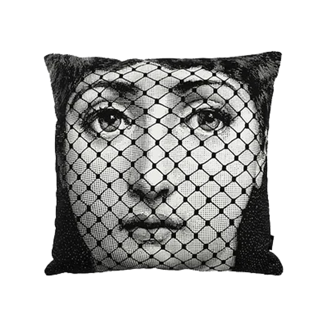 - The face of the opera singer Lina Cavalieri, re-invented by Piero Fornasetti, decorates this superior cushion, part of the iconic "Tema e Variazioni" series: a true collector's item.