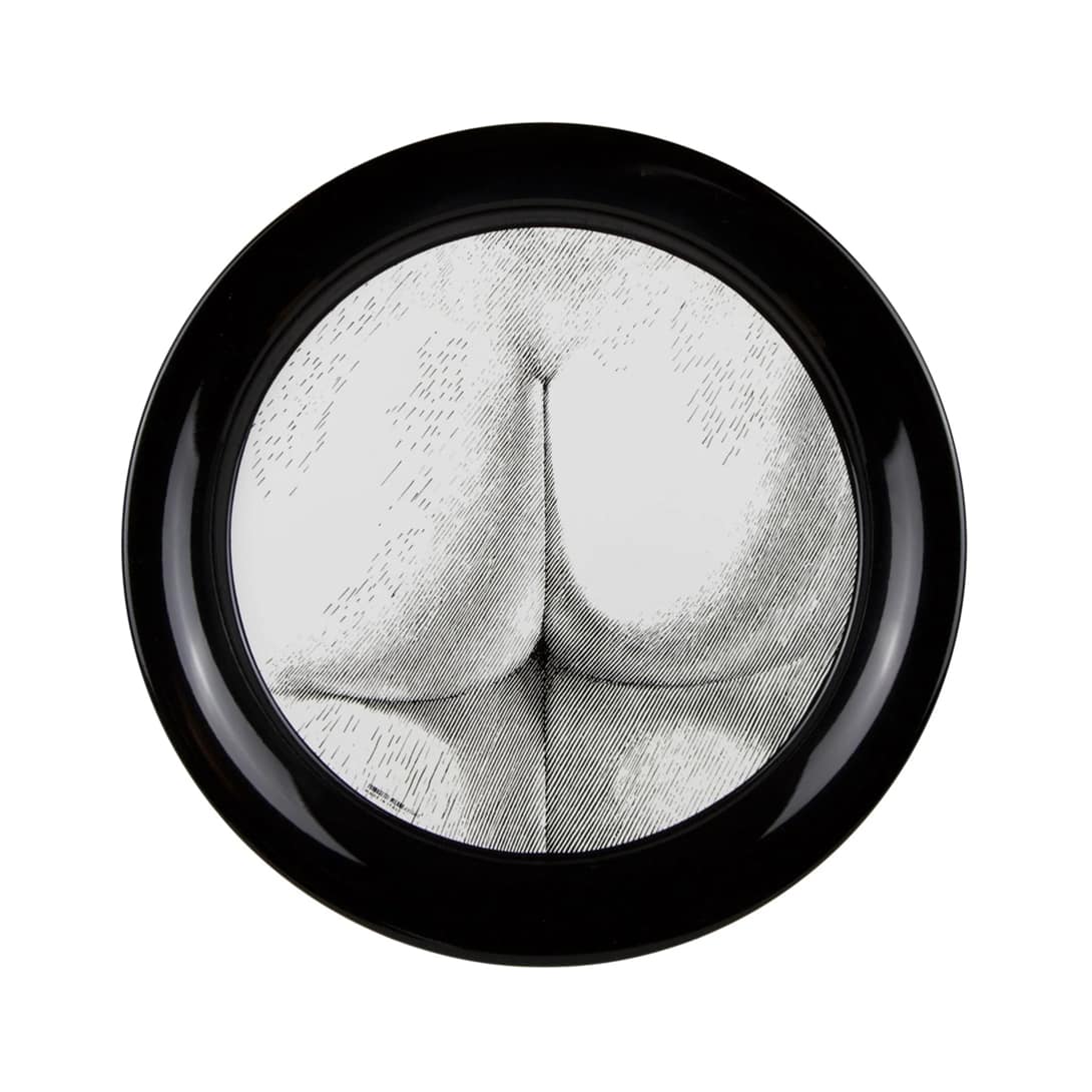 The circular shape and flat surface give great prominence to the Atelier's decorations. This hand-decorated tray features an irreverent design that dresses an everyday object with amusing irony.