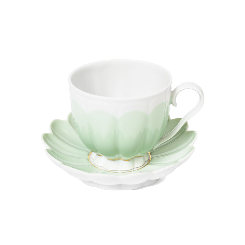 The Cairo Jaipur Coffee Cup and Saucer set, crafted by Augarten with Giambattista Valli, showcases a scalloped celadon and Nilus Green design edged with a delicate gold rim in porcelain. Handcrafted in Vienna, this collection promises to add a touch of sophistication to your coffee ritual.
