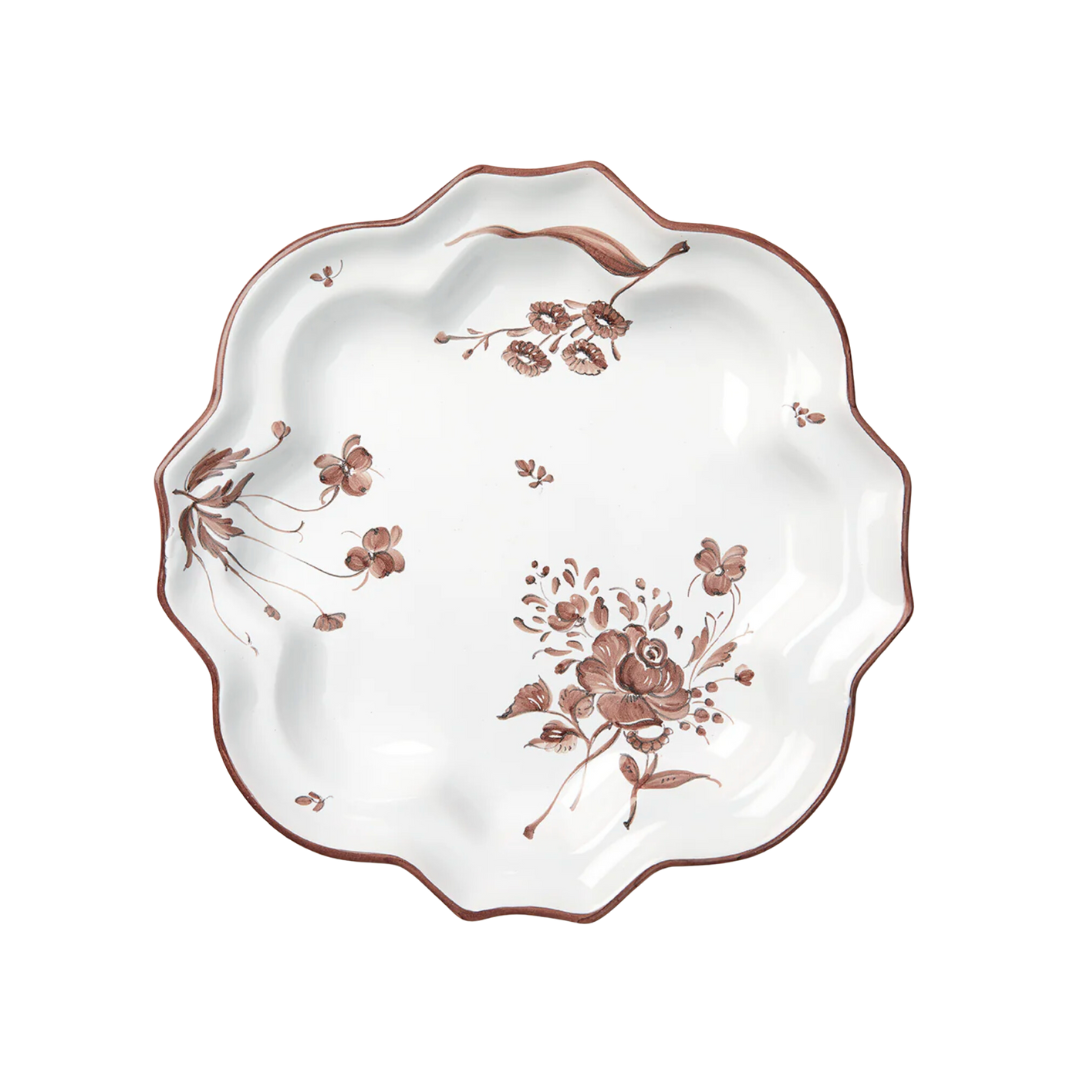 Our Camaïeu Chocolat collection is entirely hand made and hand painted by master craftsmen in Moustiers-Sainte-Marie. The rich floral design and Louis XV plate shape is a Z.d.G. by Zoë de Givenchy exclusive, made to a family design employing the Camaïeu technique in unique chocolate brown. Use with the accompanying L'Horizon dinner plate and camaïeu salad plate for a unique and beautiful table, accompanied with our embroidered ivory linens. Serving and decorative pieces are also available for a complete service.