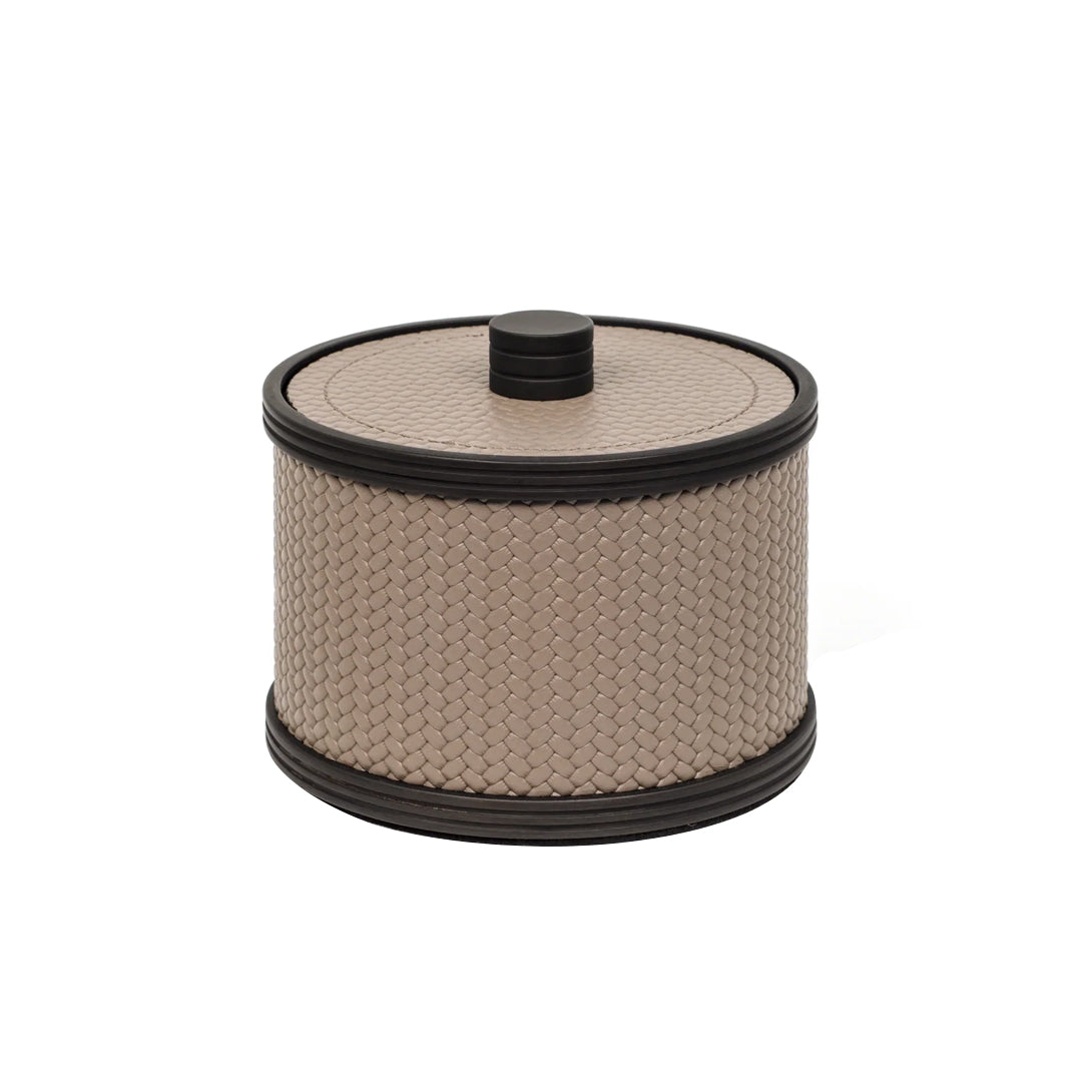 A touch of Italian sophistication. Part of the Carol bathroom set, this small round box is perfect as a cotton pad holder. Available with chrome, burnished or satin brass finishing, this item is covered with a real waterproof leather totally customizable in color and texture.