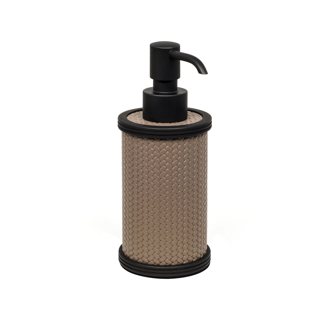A touch of Italian sophistication. Part of the Carol bathroom set, this soap dispenser matches brass and leather in a sleek combination. Available with chrome, burnished or satin brass finishing, this item is covered with a real waterproof leather totally customizable in color and texture.