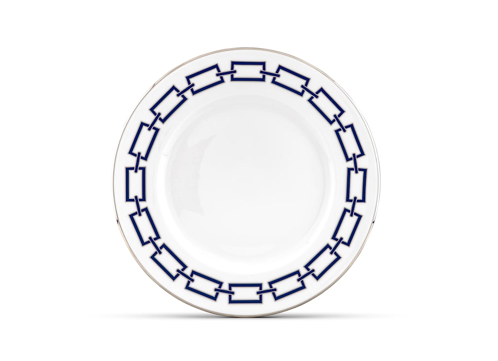This charger plate is characterized by the iconic decoration, in which sapphire blue stands out on brilliant white porcelain, creating an authentic and significant visual impact. The hand-painted platinum thread, a distinctive signature of the Ginori 1735 manufacturer, embellishes the lines and frames of the geometric motif designed by the master Gio Ponti, which is the result of a ten-phase sophisticated process of craftsmanship. The Catene collection represents the idea of modernity and the evolution of the Italian taste for the art of porcelain.