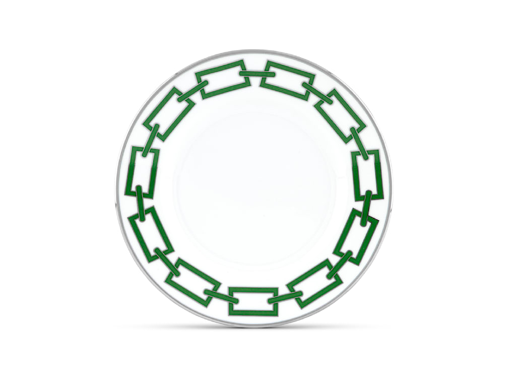 The bread plate is made of fine white porcelain and is characterized by an emerald green geometric decoration that gives life to an intertwining of refined chains. The platinum thread embellishes the lines and defines the delicate and essential Impero shape, an icon of the Ginori 1735 manufacturer.