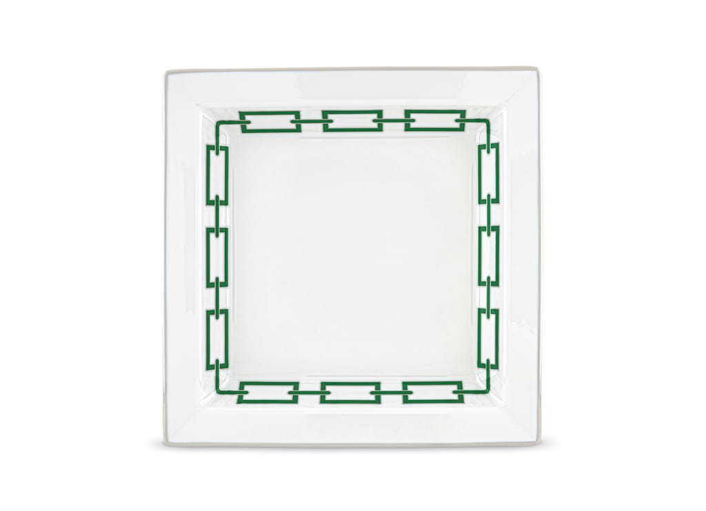Made of the finest porcelain, the square plate is characterized by the iconic emerald green geometric "Catene" decoration, designed by the creative genius of Gio Ponti and the result of a sophisticated ten-step manufacturing process. The platinum threading, a distinctive signature of the Ginori 1735 manufacturer, embellishes the lines and illuminates the design to enhance each course and allow diners to experience an authentic gourmet journey on every occasion of conviviality.