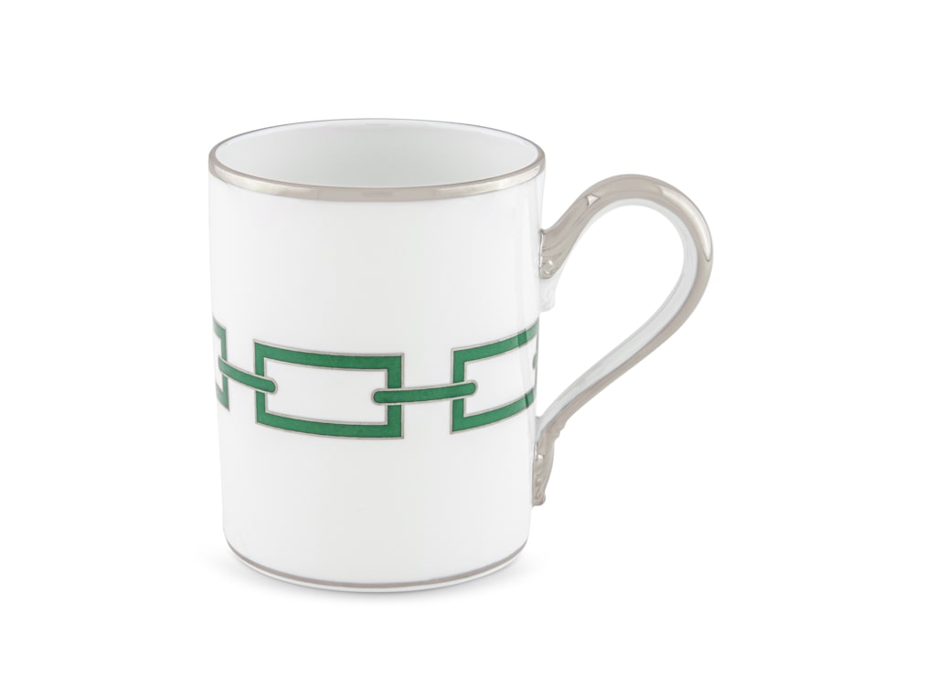 The Catene Mug is made of fine porcelain with an emerald green decoration that is intertwined with a sophisticated and essential geometric pattern. The hand-painted platinum thread embellishes the design, paying homage to the unmistakable style of Ginori 1735. Holds 13 fl. oz.