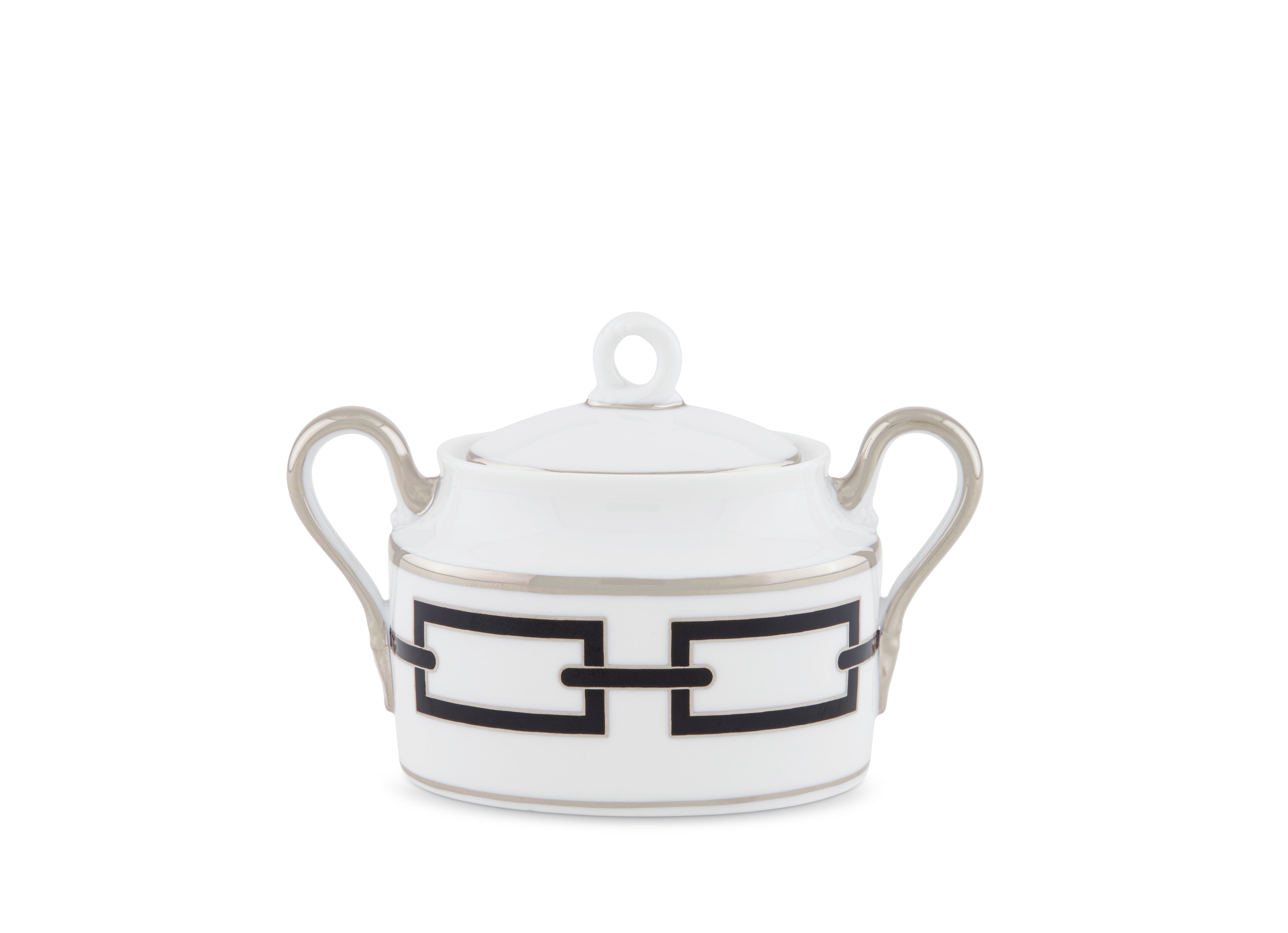 A perfect porcelain sugar bowl for your relaxing breaks. This sugar bowl with lid is embellished with black geometric patterns and platinum details, a now-iconic pattern from the creative genius of Gio Ponti. It combines perfectly with tea or coffee cups, mugs, saucers and platters from the Catene collection, creating a complete set in an iconic and timeless design.