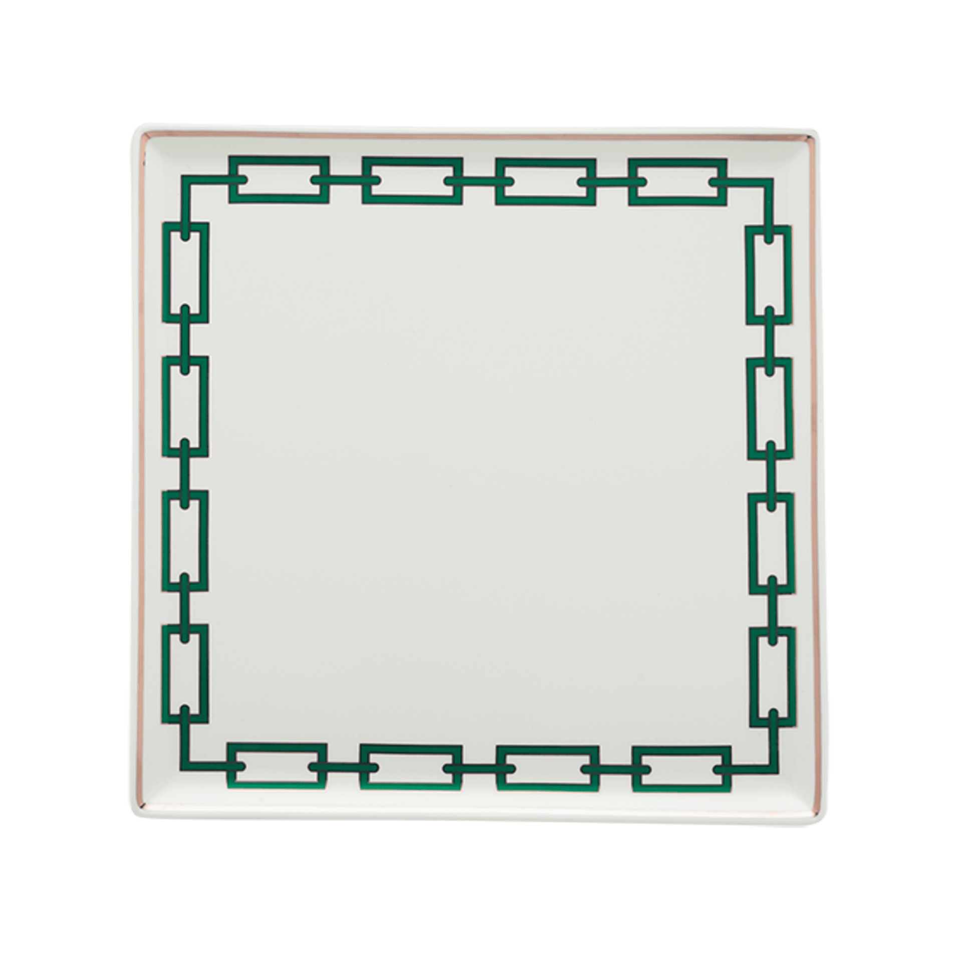 The square centerpiece is made of fine white porcelain decorated with an emerald green geometric pattern that evokes an intertwining of refined chains, designed by the creative genius of Gio Ponti. The platinum thread, a distinctive signature of the Ginori 1735 manufacturer, embellishes the lines and illuminates the design, for an unforgettable gourmet experience.