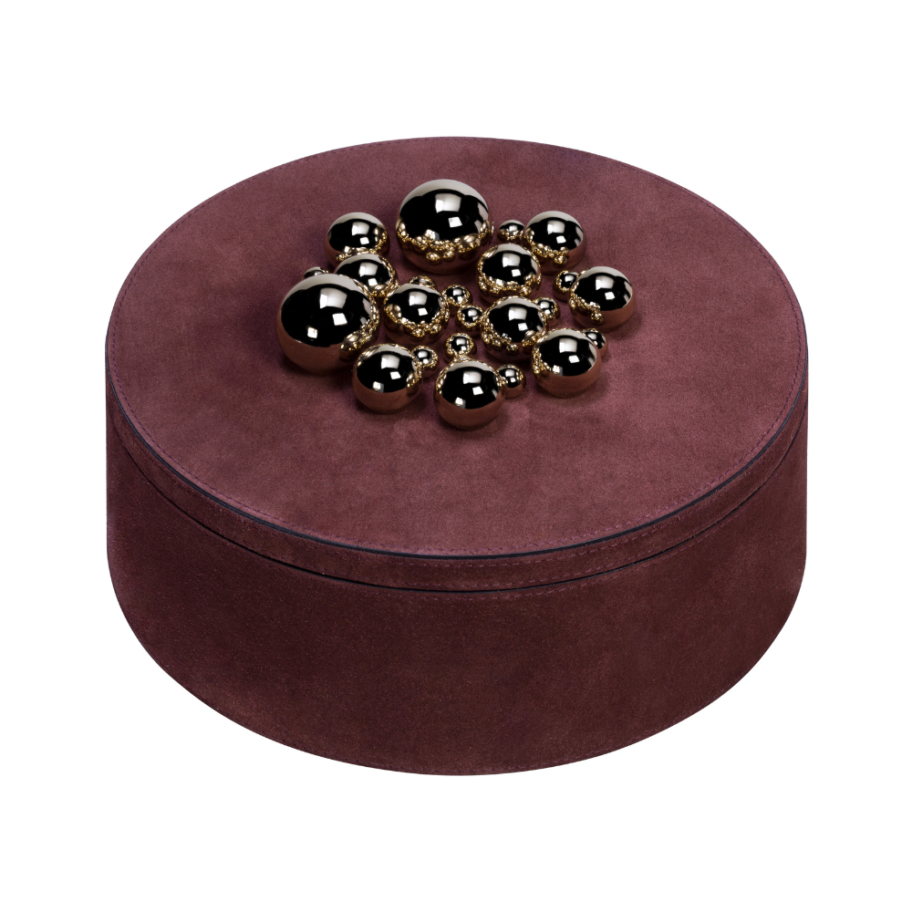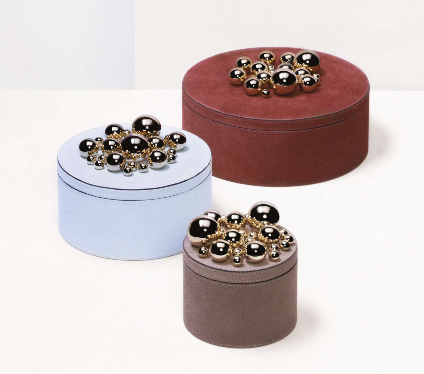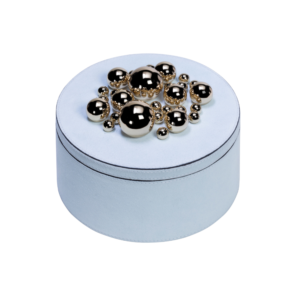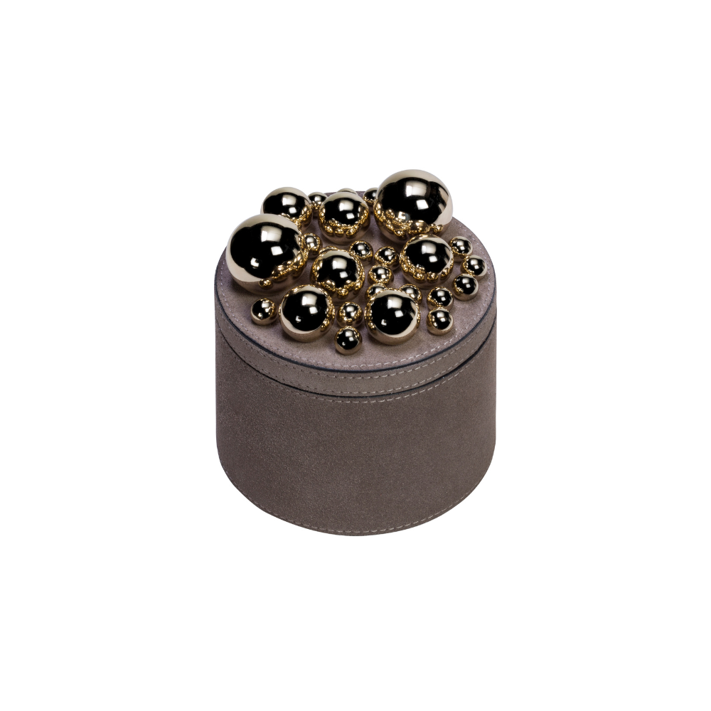 The contrast between pure geometric forms, such as the prism and the sphere, has always fascinated the human being. In a game of references between the architecture of Etienne-Louis Boullée and the surrealist sculptures of Pol Bury, the golden spheres of this collection transform the simple handle of a box into an element of high decoration that invites you to come closer and explore its shape and function.