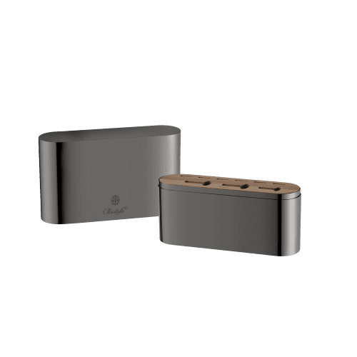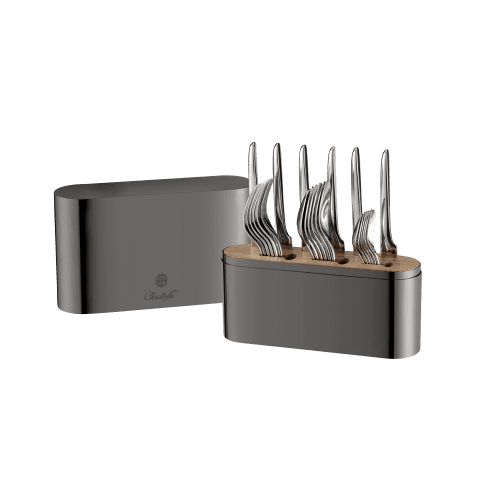 The Concorde Variations box has been specially designed to accommodate a set of 24 place settings (6 table forks, 6 table knives, 6 table spoons, 6 teaspoons) from the 5 Christofle Acier collections: Albi, L'Âme de Christofle, Origine, Osiris, Perles. Combining aesthetics and utility, decorative object or directly placed on the table, everyone can help themselves as they wish, according to their needs and without protocol. An elegant alternative to the art of no longer setting the table. Not dishwasher safe. (Flatware not included.)