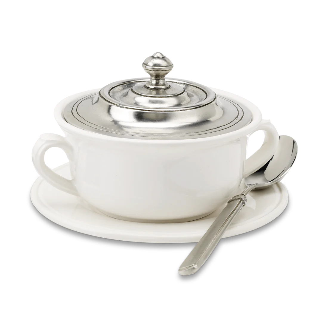Not only does this elegant covered soup bowl keep its contents piping hot from kitchen to table, it makes for an inspired presentation that's sure to make your guests smile. Made by hand from ceramic and Italian pewter. Spoon pictured not included. Holds 5.4 oz.