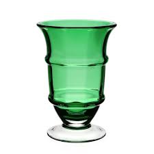 A beautiful footed vase with a soft apple green bowl and clear base. It is a clever piece of handblown glass with a horizontal strap around the perimeter of the bowl. A particularly useful size for all sorts of bouquets and cut flowers.