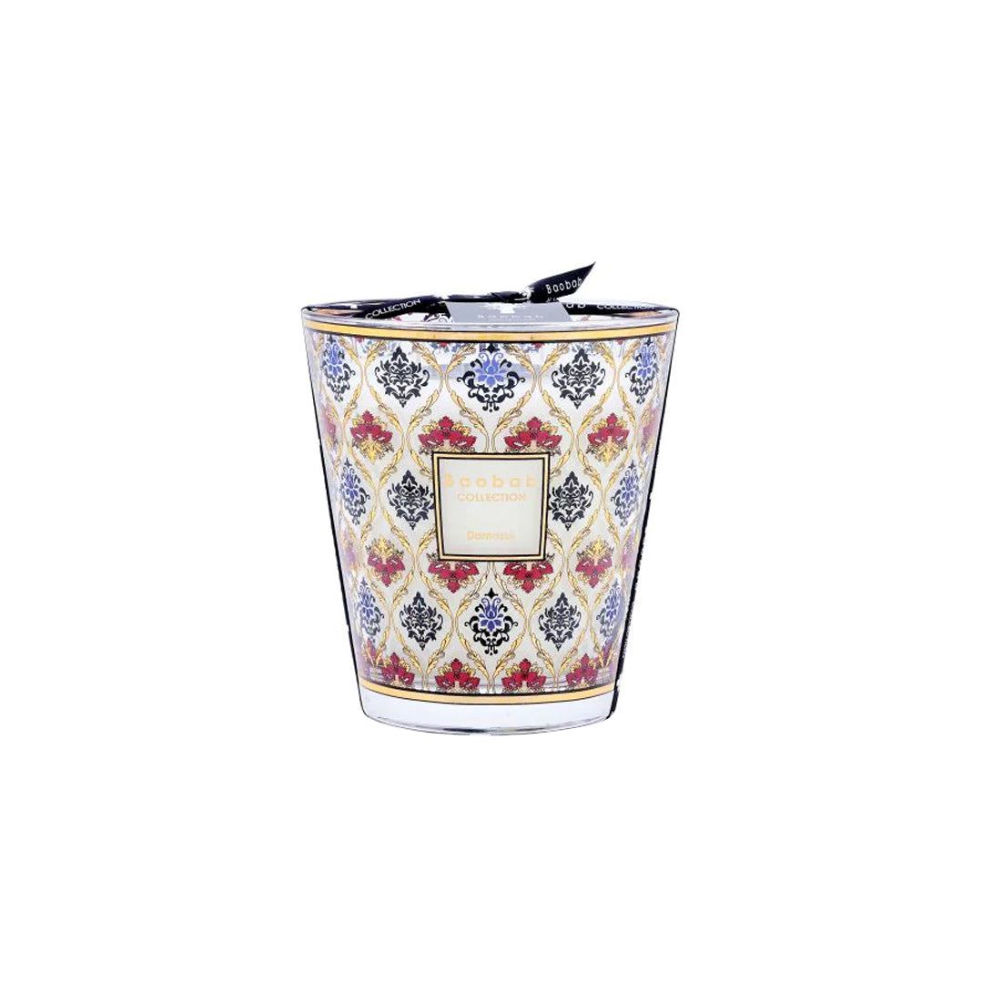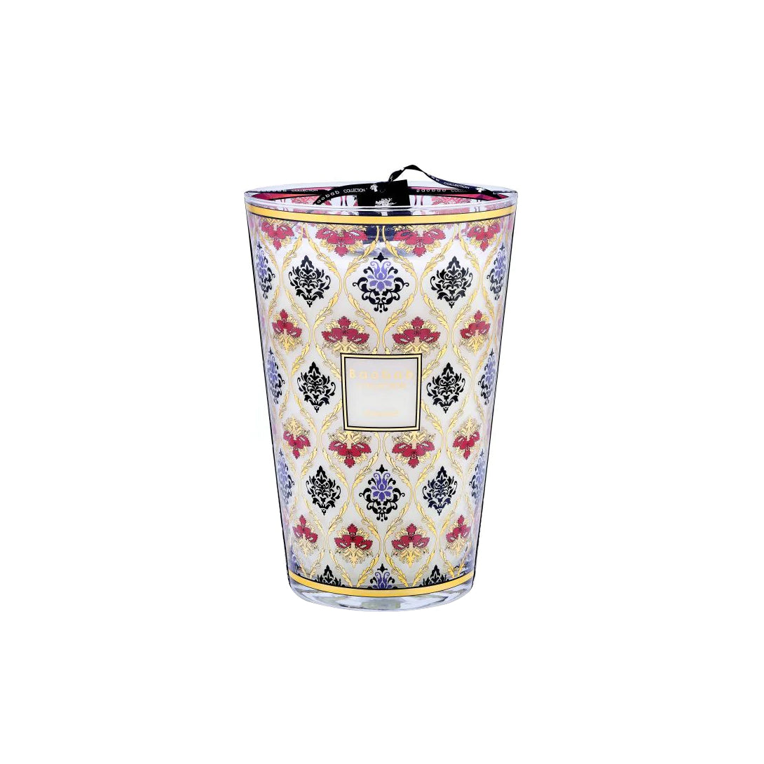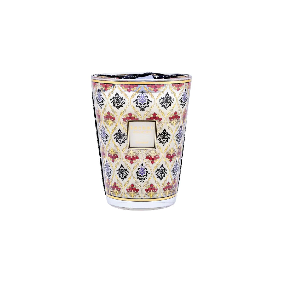 The Damassé scented candle features a screen print in gold, purple and red, which is based on the floral motifs of the famous fabrics it is named after. In contrast to its original monochrome look, the motifs are coloured in red, purple and black, recalling the colours of the wall hangings in Roman palaces.