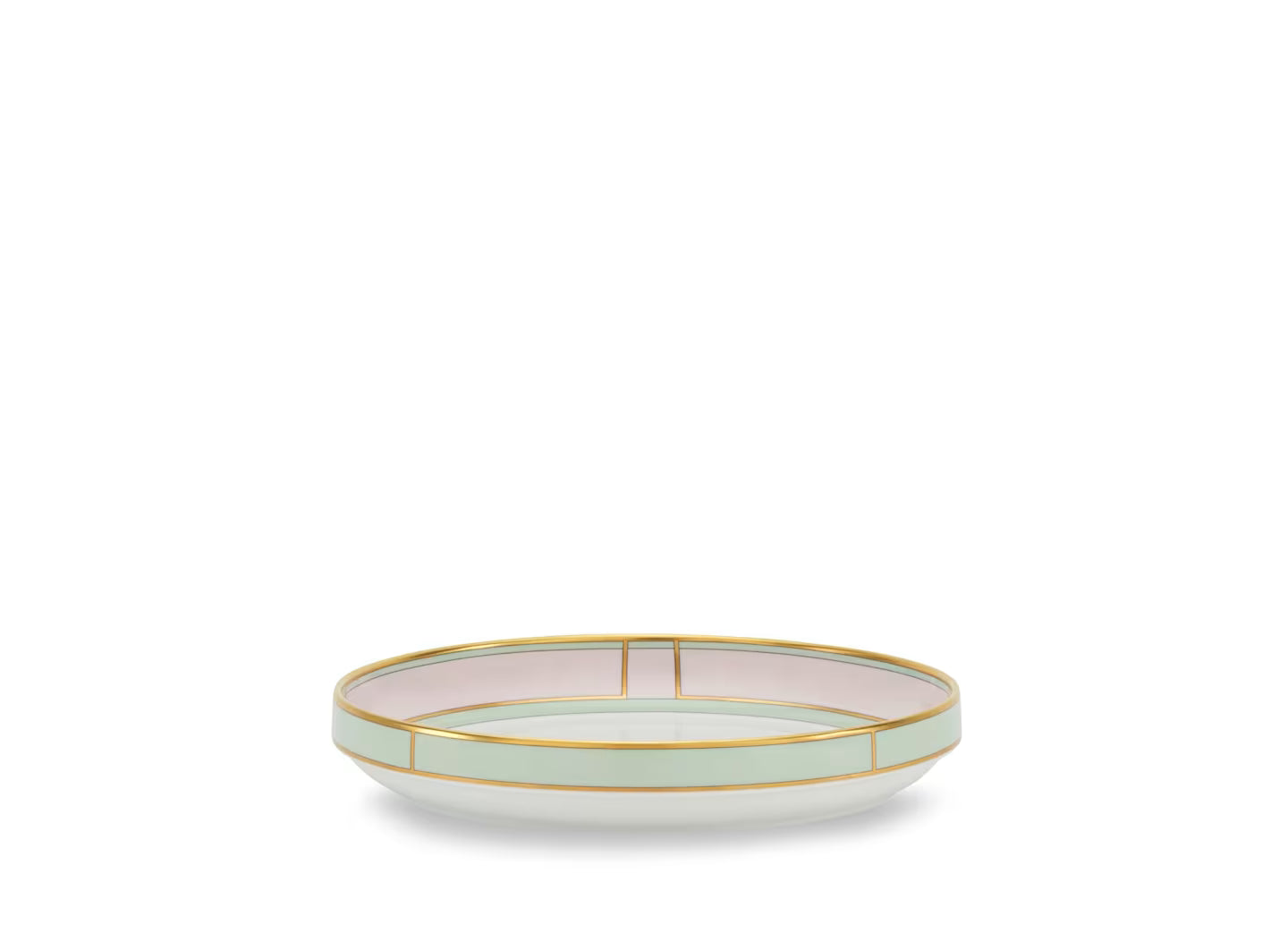 Pastel green and sky-blue hues characterize the decorative motif of a 1950sdesign enhanced with delicate gold threading. Diva enriches the Ginori 1735 range of porcelain dishes with this collection of tableware and giftware, a contemporary reinterpretation of Giovanni Gariboldi's Colonna design from the mid-1950s that features stackable elements perfect for storing in small spaces. Eclectic and versatile, it will beautify the table with elegance and refinement. Dia 9.5"