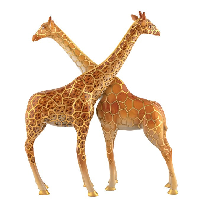 A symbolic pose reflects the intersection between mother nature's spotted decoration and an artist's striking reinterpretation of the giraffe's iconic pattern. A crossroads of science and imagination, one giraffe is looking back at the wonders of the evolutionary path while the other is looking forward to the expanse of creativity. Balancing and unifying the composition are dramatic 24K gold highlights which beautifully accentuate the spots. Limited Edition