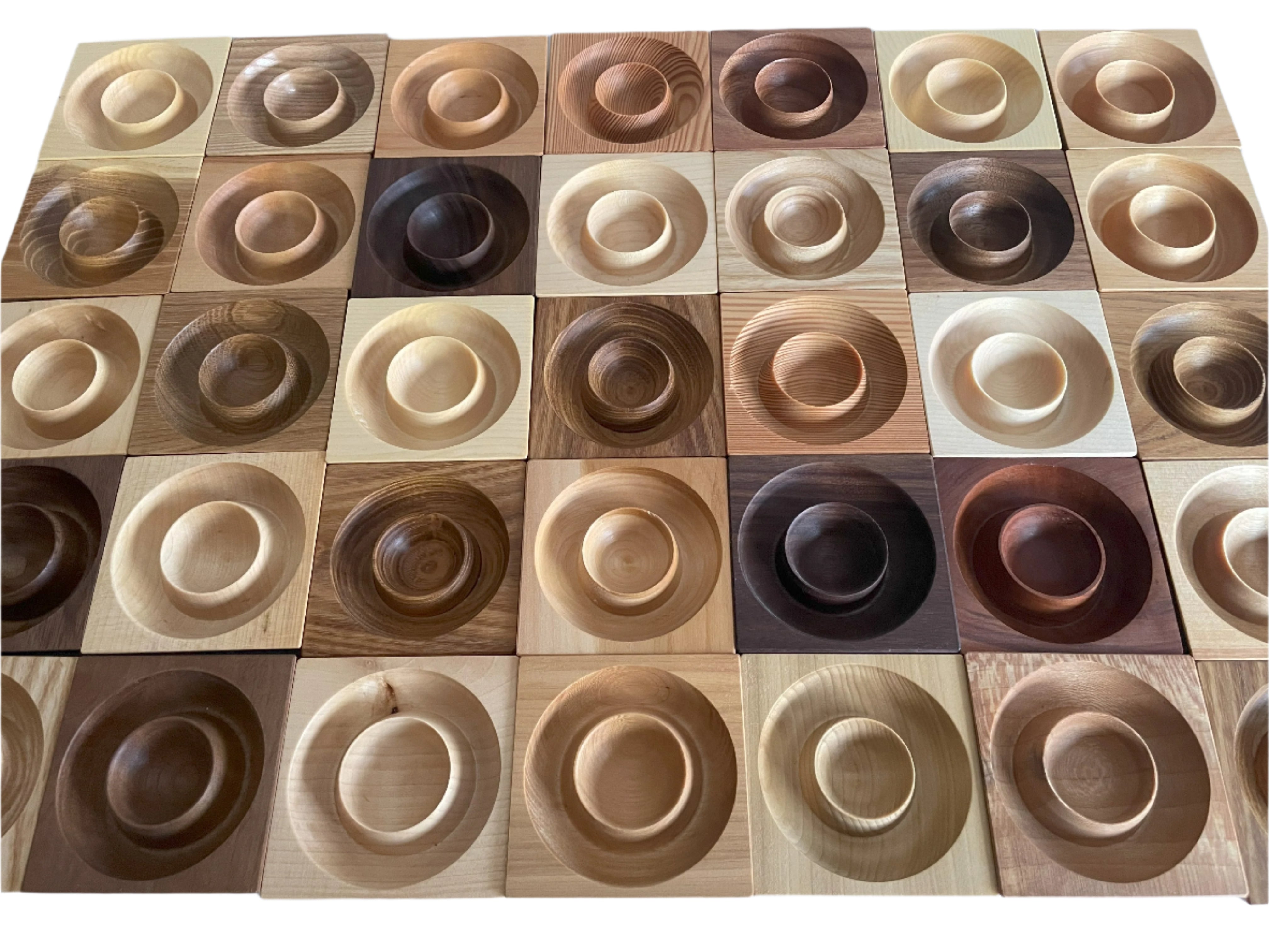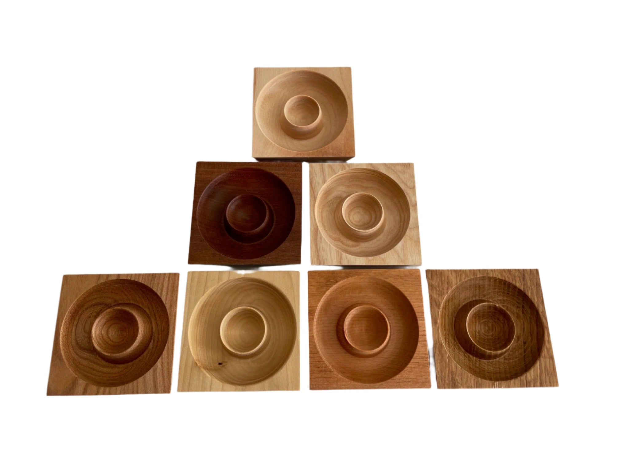 The eggshells are made of cherry, plane tree, plum, robinia and elm, among others. The gutter absorbs the shell residues and prevents spills on the tablecloth. The eggshells are embedded with olive oil from organic farming and can be washed by hand and should be oiled with olive oil from time to time.