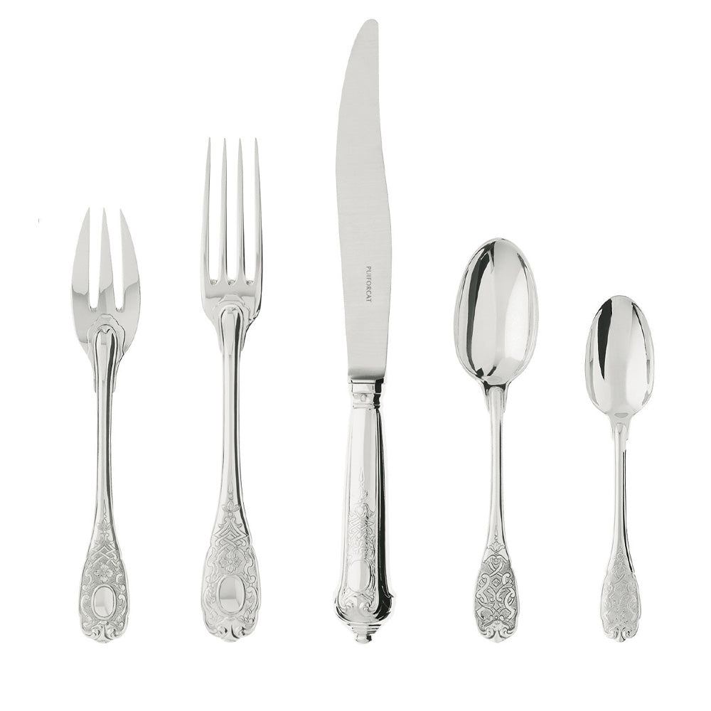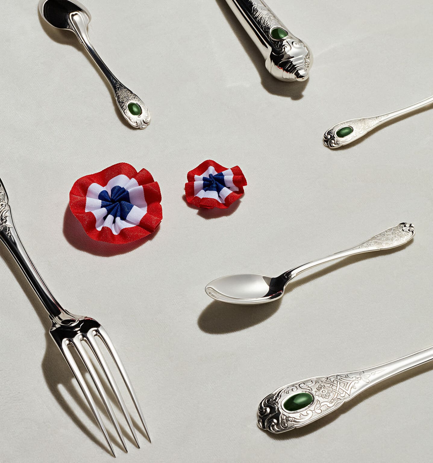 This early 18th-century Bavarian-style service has graced the ceremonial tables of the Presidents of the French Republic at the Élysée Palace since the late 1940s. The delicate chasing on the sterling silver handles requires meticulous hand-finishing. The elegance of the Elysée model can be enhanced by the addition of ornamental gems: a cabochon of onyx, jade or red jasper is set and placed à la française on the bottom of the handles.