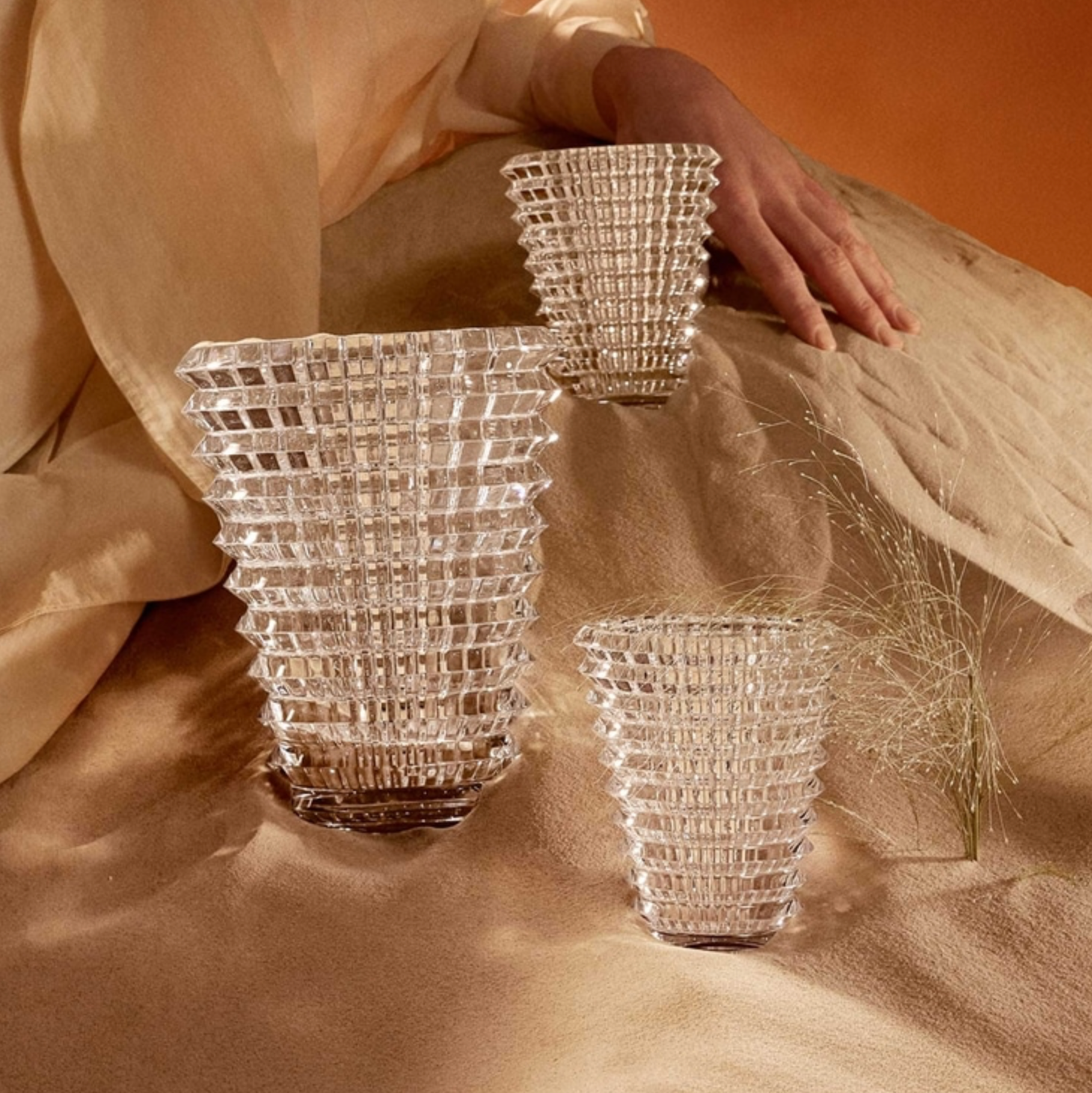 The wavy design of the crystal Eye vase comes from an extraordinary technique: exterior horizontal cuts and interior vertical cuts combine to produce a magic visual effect. With bevel cuts conjuring perpetual movement, the Eye vase is a spiral of light. The Eye Vase fabrication produces a multitude of shades and shapes leaving scope for an infinite number of compositions for every taste and in every color.