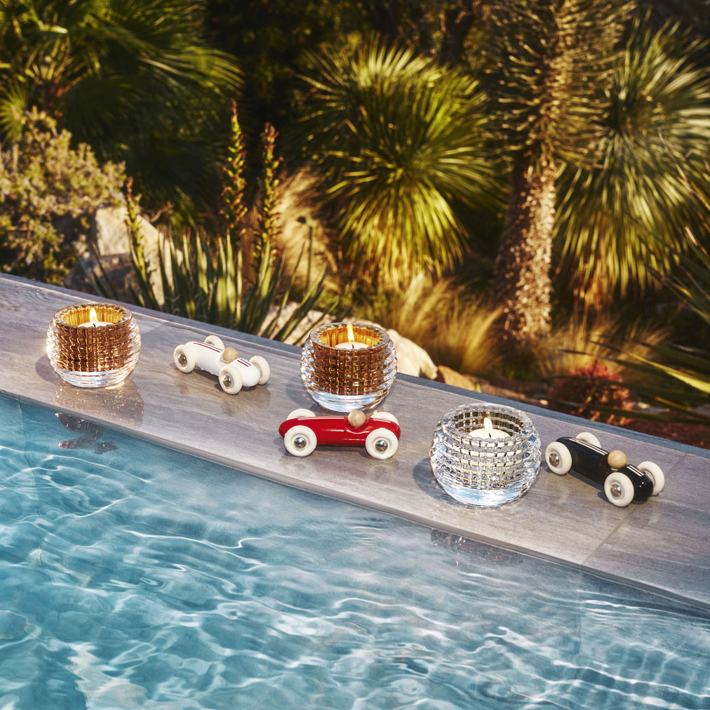 Available in clear, red, gold, white and silver crystal, the Eye candle-jar brilliantly reflects candle-light. Fashionable colors make this a modern piece with unmatched technical sophistication. The collection features horizontal exterior cuts and vertical interior cuts and is also developed into rectangular and oval vases.