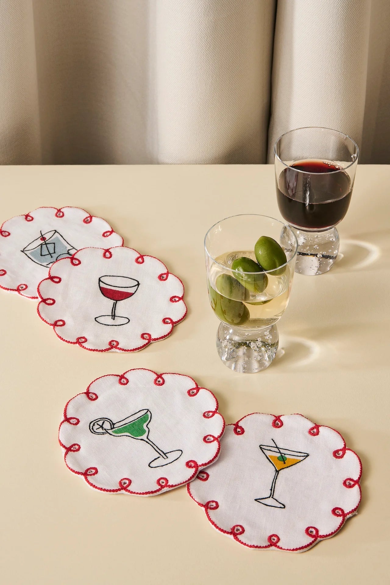 Made with 100% extra-thick linen, this set doubles as coasters and cocktail napkins. Featuring prints of your favorite drinks and an embroidered edge with cut-out eyelets, the artful details bring extra joie de vivre to every happy hour.