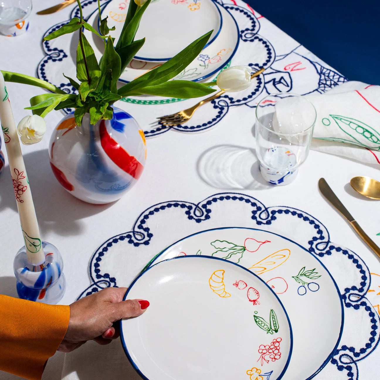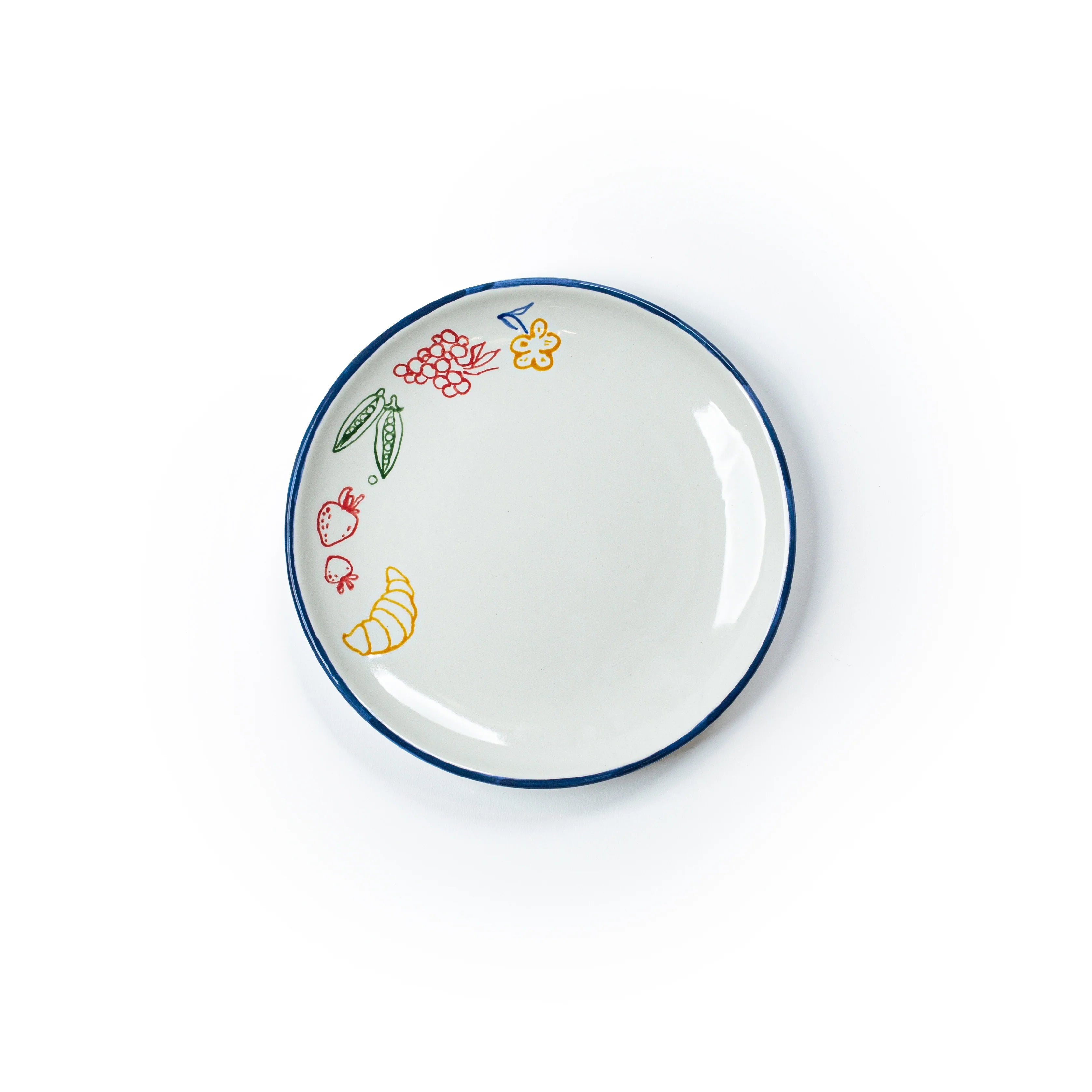 Featuring a hand-painted blue trim and our designer Leslie Hamilton’s hand-drawn motifs of Parisian picnic favs (croissants! fruits! flowers!), these salad plates will bring an infectious kind of happiness to your mealtime. Pair it with the matching dinner plates for a casual dinner party.