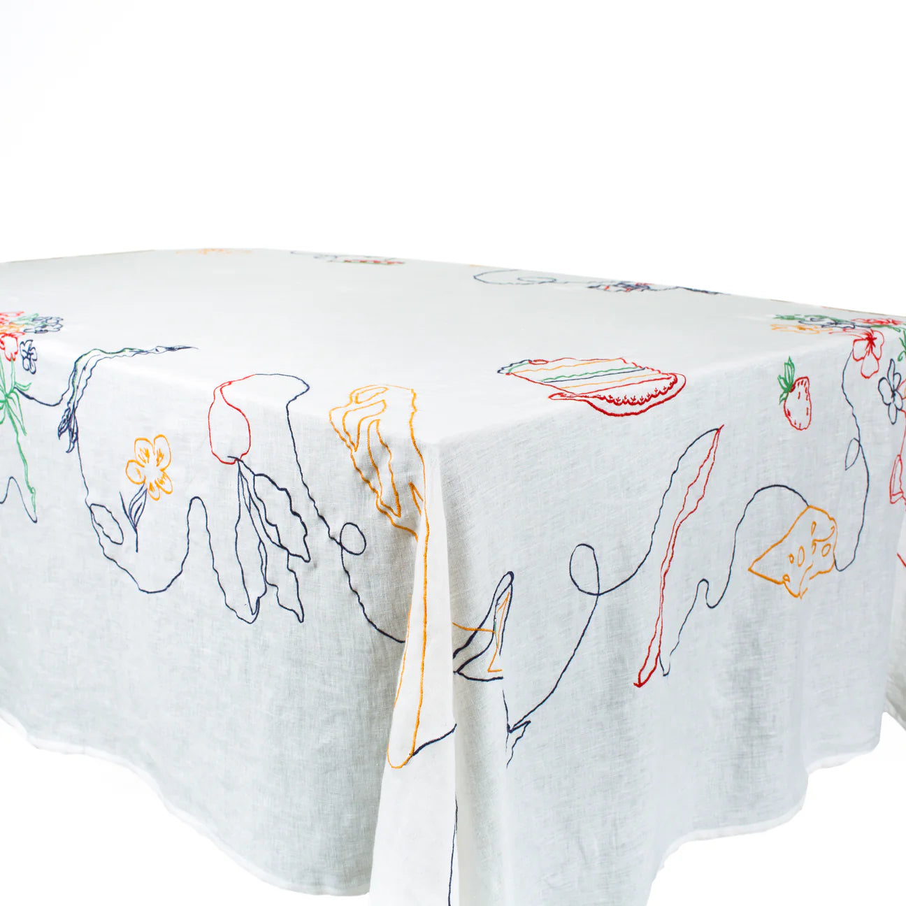 Turn up the party vibes with this punchy tablecloth. Its high-quality linen comes embroidered with everyone’s favorite good-time staples (cocktails! baguettes! dessert!), all from the sketchbook of Misette’s product designer Leslie Hamilton.