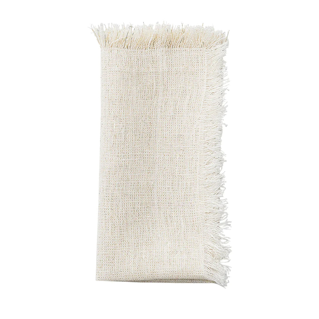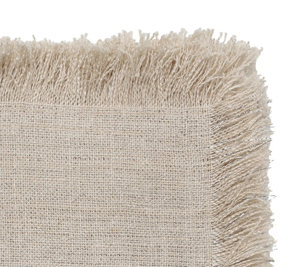 The Fringe Napkin is a glamorous take on farmhouse chic. It is expertly crafted from silver lurex (a sparkling tinsel material) and is woven with linen, giving the fringed napkin an elevated shimmer. Perfect for a rustic holiday gathering—or anytime you want to spruce up your dining table!