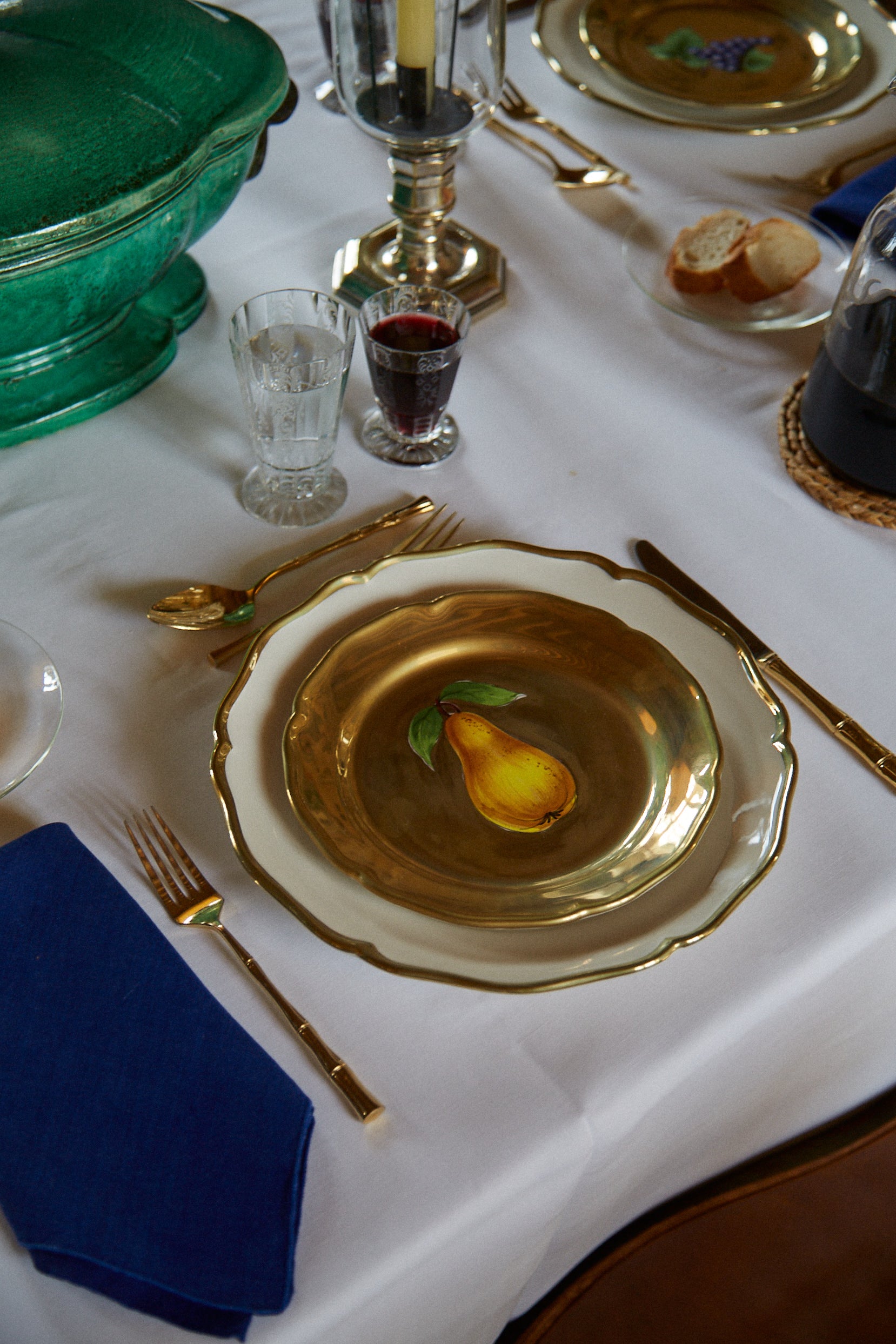 Hand glazed in real gold and each hand painted by master Italian artisans to feature an autumn fruit, these salad or dessert plates are hand made exclusively for Z.d.G by Zoë de Givenchy. See them glimmer by candlelight at an autumnal dinner and amp up the glamour at a beautiful holiday celebration.