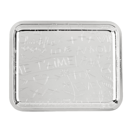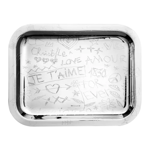 Add a dash of visual interest and décor with this silver plated Graffiti rectangular serving or display tray. Raised rim with an offbeat design reminiscent of an urban alley or doodled-on notebook. Can be used as a valet tray to organize your keys, loose change and more. Peace signs, hearts, flowers and phrases like “je taime” (French for “I love you.”) make it a perfect gift for pop art appreciators, the young at heart and teens.