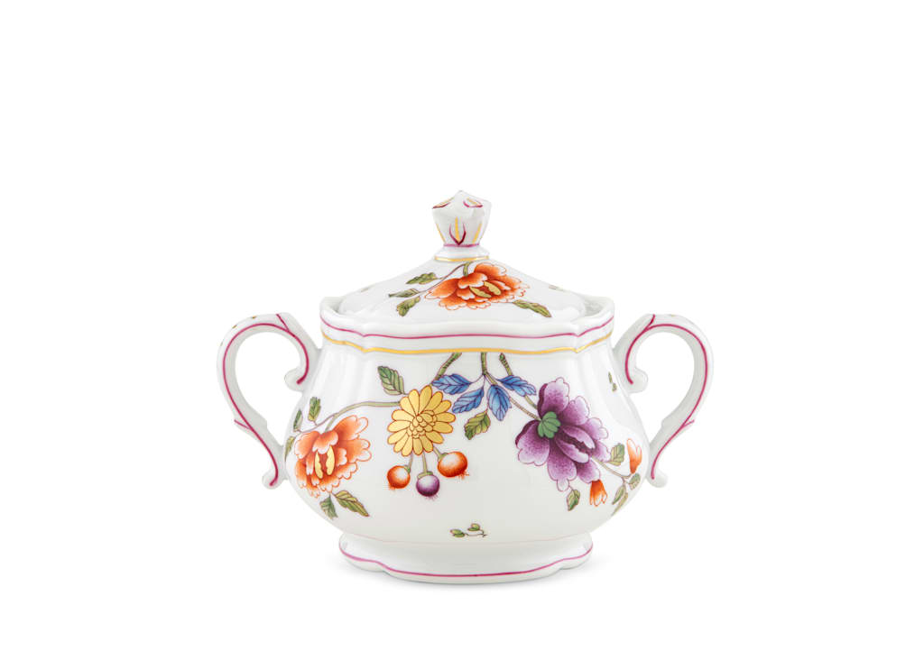Fine porcelain is brought to life by the celebrated "alla Coreana" or Korean style pattern, which features the Peonia and was inspired by the fondness that Florentine noblewomen once harbored for layering and the decorative patterns of imperial kimonos. Pure gold threading, a hallmark of the Florentine Manifattura, enriches the design as it traces and accentuates the contours of the classic Antico Doccia shape. Holds 13.8 oz.