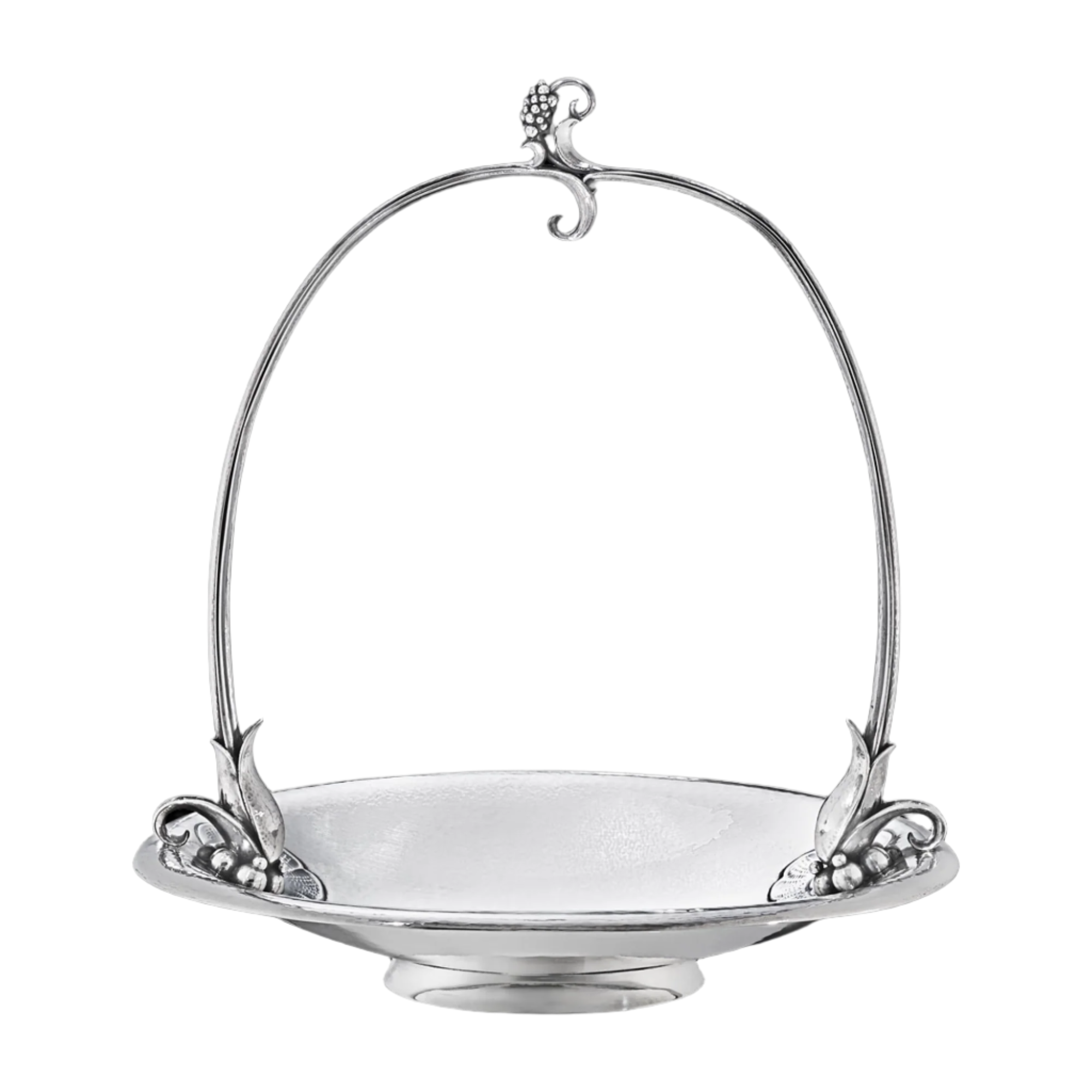 This beautiful Grape stand was designed in 1929 and is a good example of the simplicity and limited stylised ornamentation which characterized Harald Nielsen’s designs. Clusters of grapes can be hung from the hook under the handle and clipped grapes are caught in the bowl underneath.