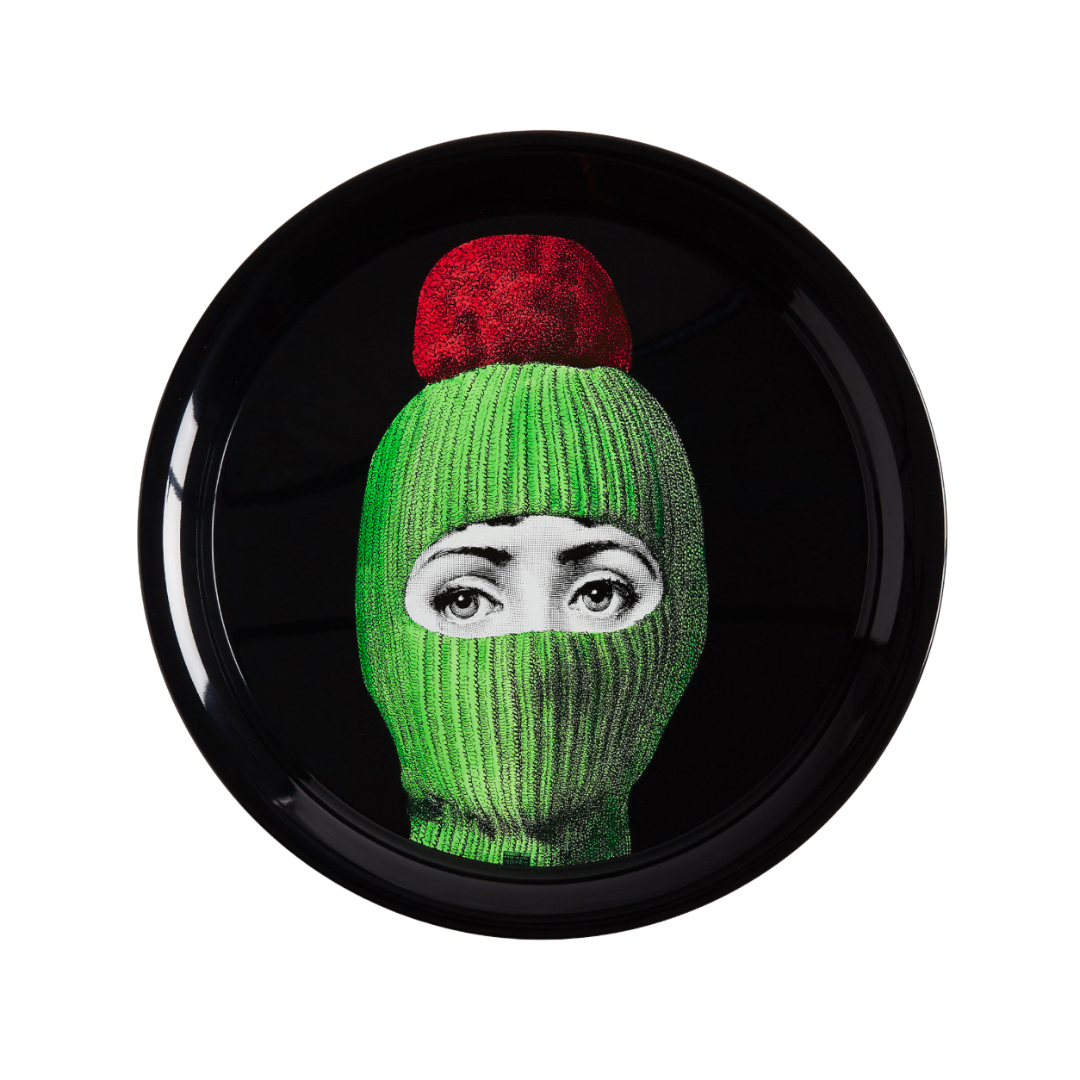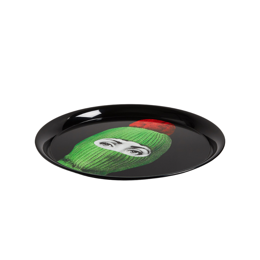 The circular shape and flat surface give great prominence to the Atelier decorations. This hand-silkscreened, painted, and lacquered tray features the famous Lux Gstaad decoration standing out against the black background in all its irony. Combined with a foldable stand, the tray can be transformed into a coffee table.