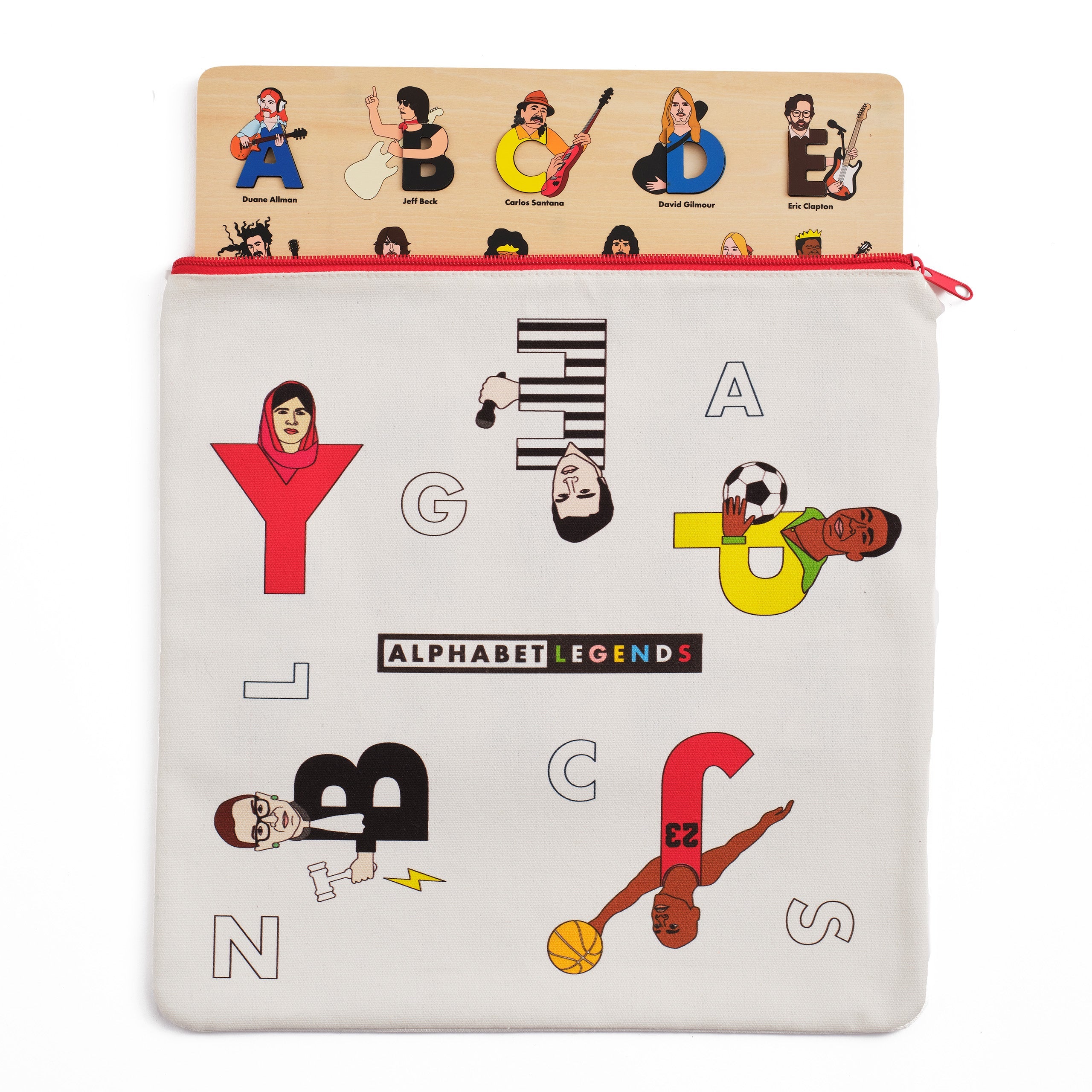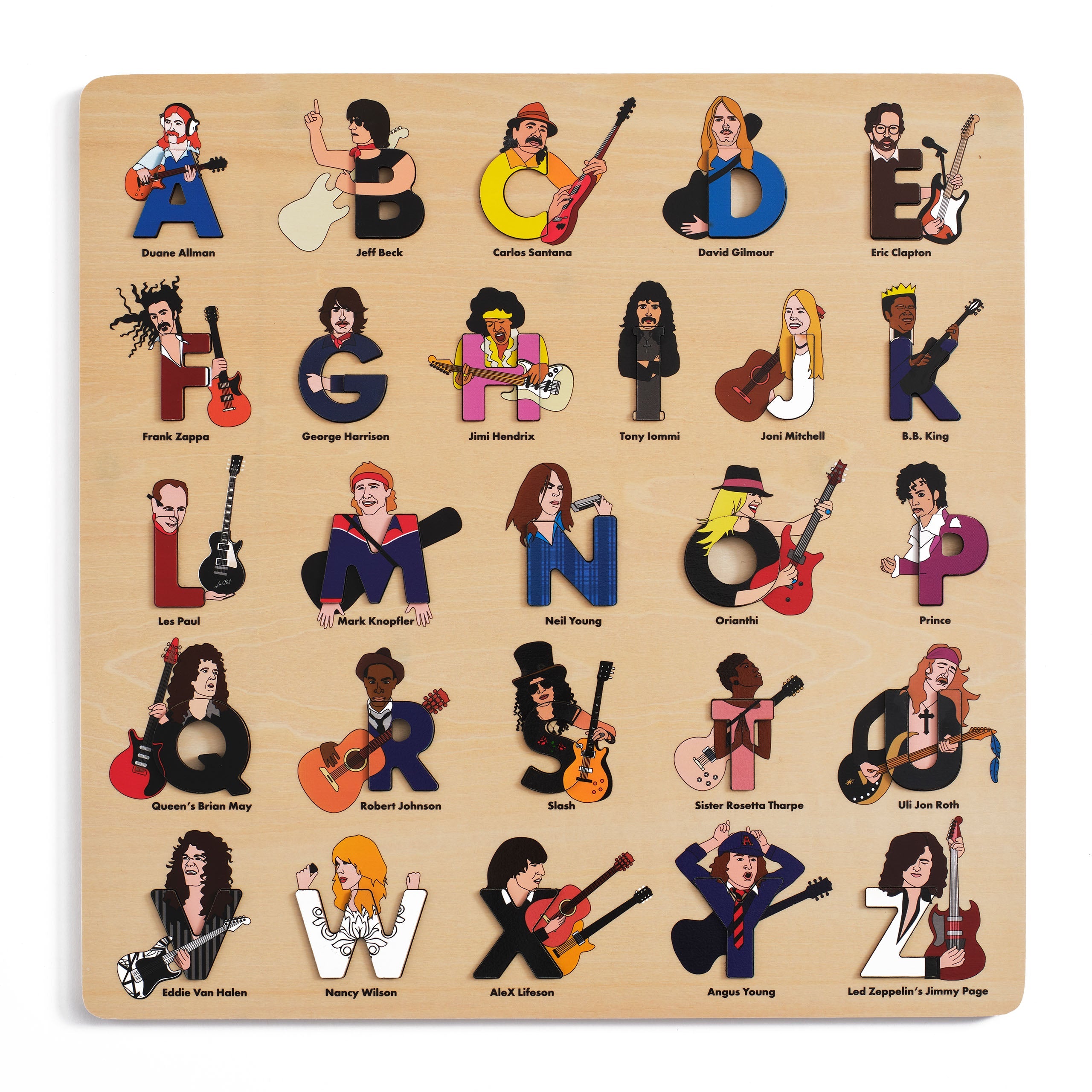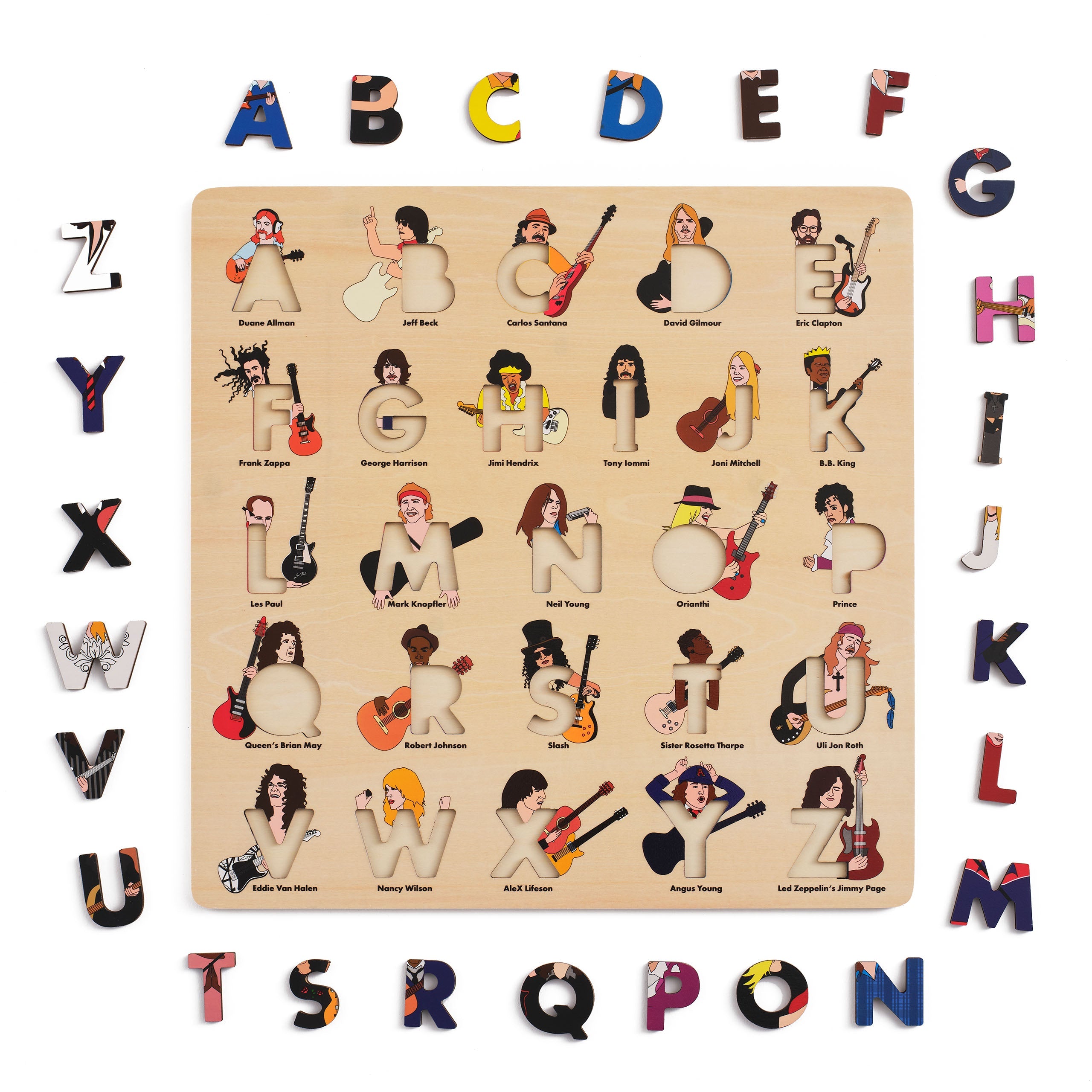 A beautifully crafted wooden alphabet puzzle for little guitar lovers. From Jimi Hendrix to Angus Young, Orianthi to Sister Rosetta Tharpe, Guitar Legends Alphabet strings together an A to Z of the most gifted axe men and women to ever strut the stage. The perfect way to introduce the alphabet.