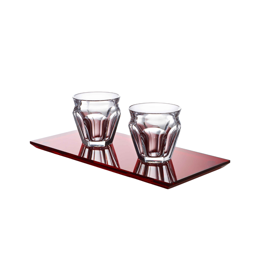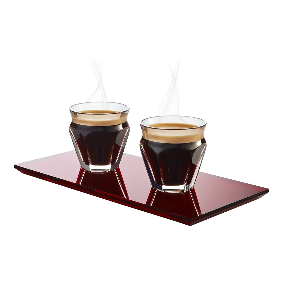 Indulge in a refined espresso moment with Harcourt Coffee Set. The finest crystal cup in the historical "king" Harcourt cut, paired with a chic red tray and two crystal glasses, creates a hedonistic coffee experience. A perfect gift for your epicurean friends.