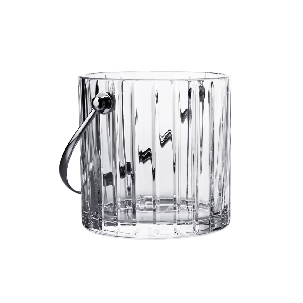 The Harmonie Clear crystal ice bucket has a stainless steel handle and features the sweep of vertical striping characteristic of the Harmonie barware collection. Parallel vertical lines travel cleanly along the silhouette from the lip to the thick base, the streamlined form like a thick Clear crystal column. The stripes are subtly yet precisely etched into the Clear crystal surface of the glass. Not only do they bring a textural quality, but they also create a depth of form that is visually resplendent—all the more so when the bucket is full of cold, glistening ice. The Harmonie collection of barware extends to highballs, tumblers, and both Round and Square Whiskey Decanters. All of these pieces complement a well-stocked bar for the smoothest of drinking experiences. Harmonie is the collection for creative cocktail enthusiasts and lovers of rare whiskies.