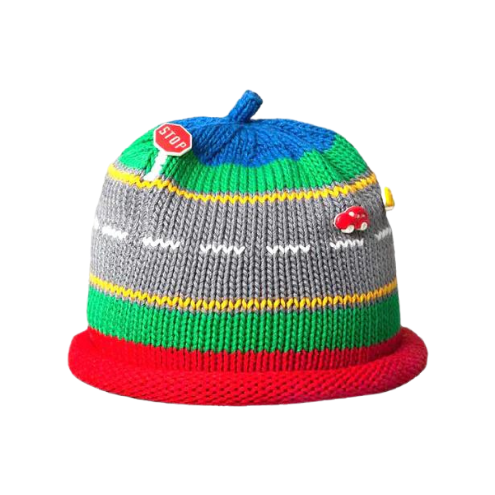 Hit the highway in style wearing a knit hat in primary colors of red, green, and blue. The cap features a wide gray stripe with a broken white stripe through the center and bordered with a thin yellow stripe to create a street scene.