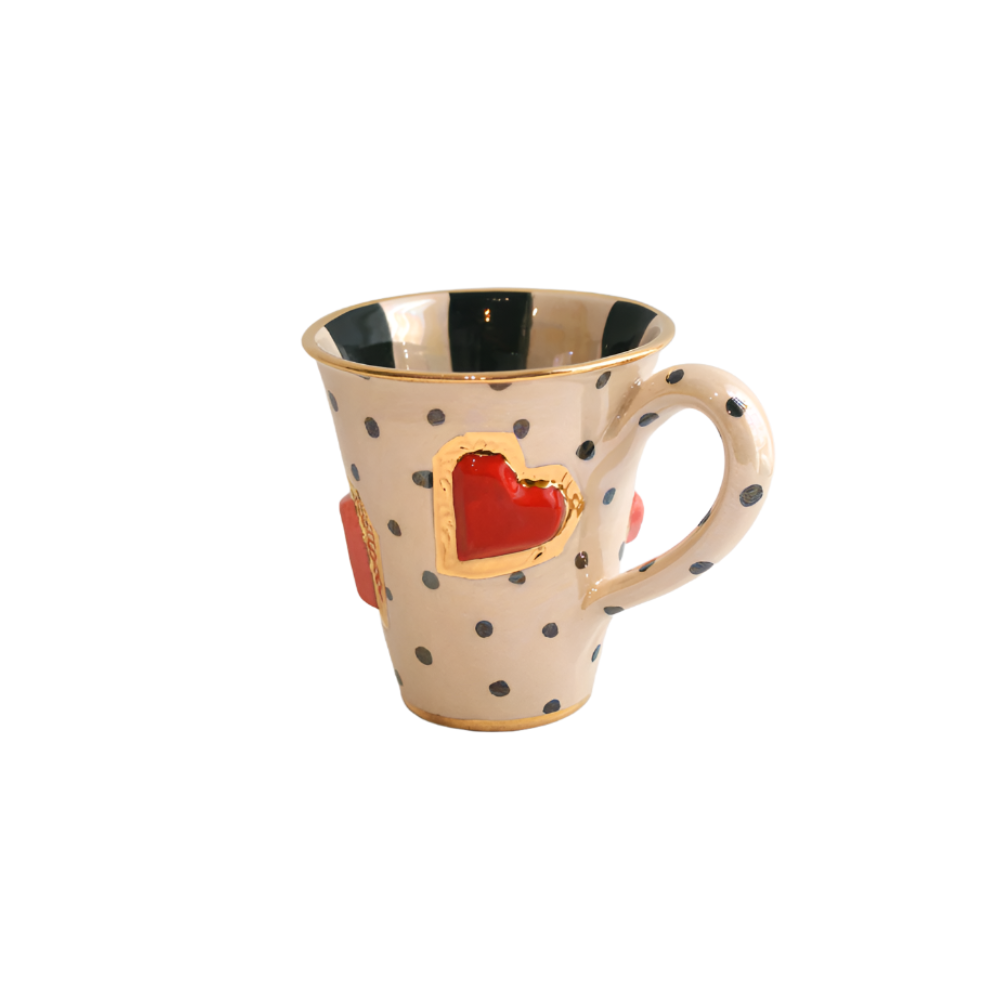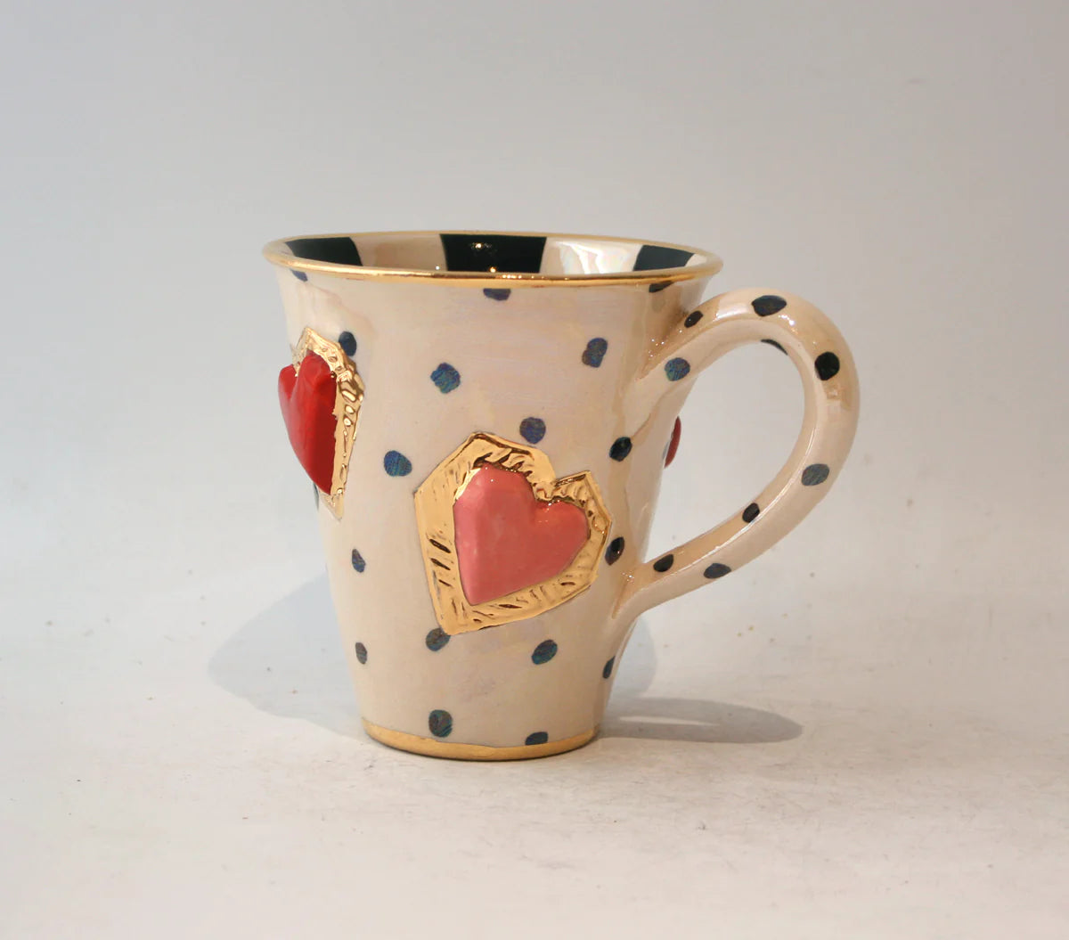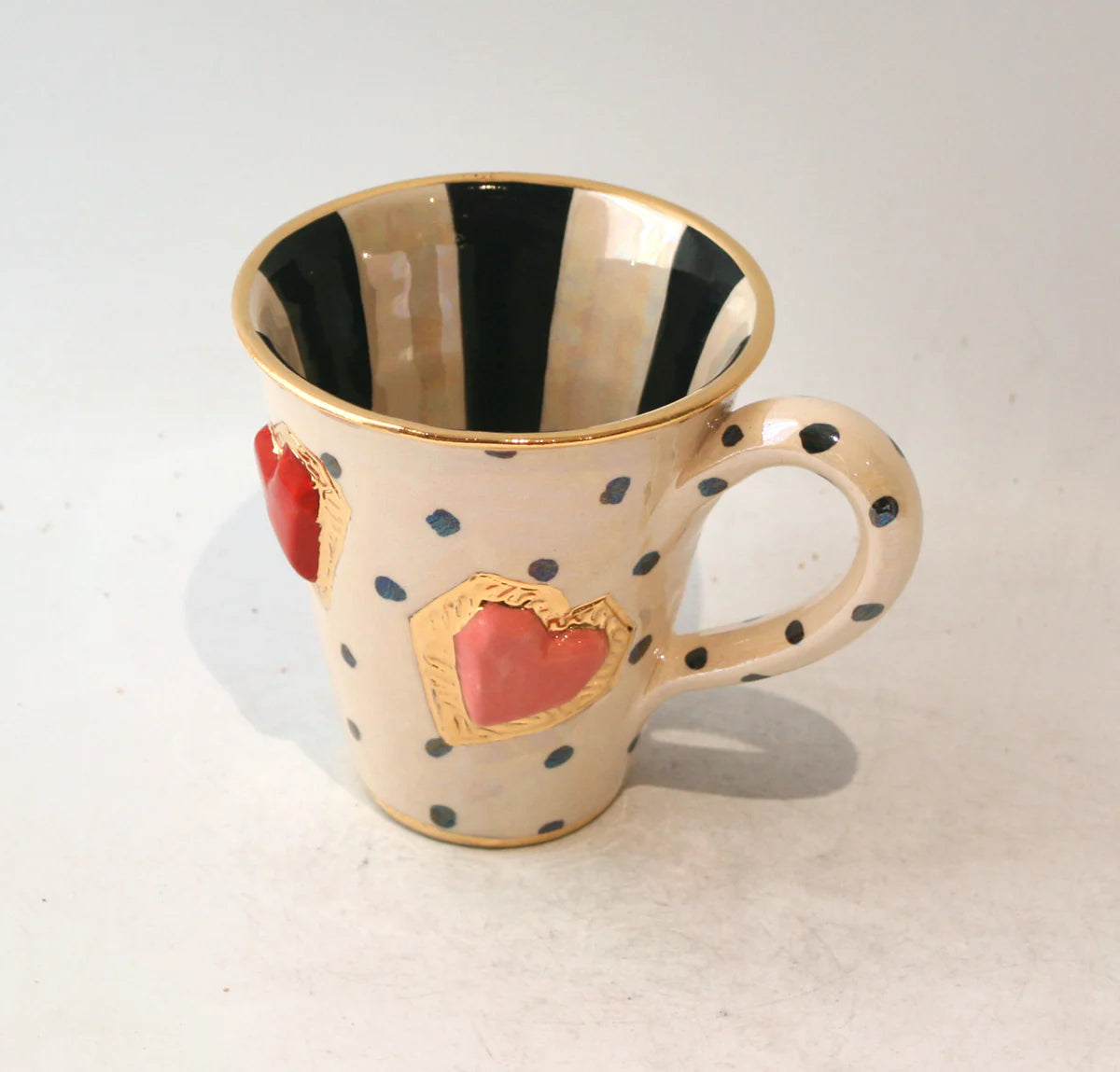 Add a touch of romance to your daily coffee ritual with this stunning Jeweled Heart Mug. Crafted by acclaimed artist Mary Rose, this large mug features a playful polka dot design adorned with pink and red hearts. Its elegant black and white striped interior and accents of 24 carat gold make it the perfect gift for your loved one.