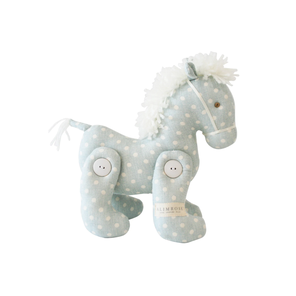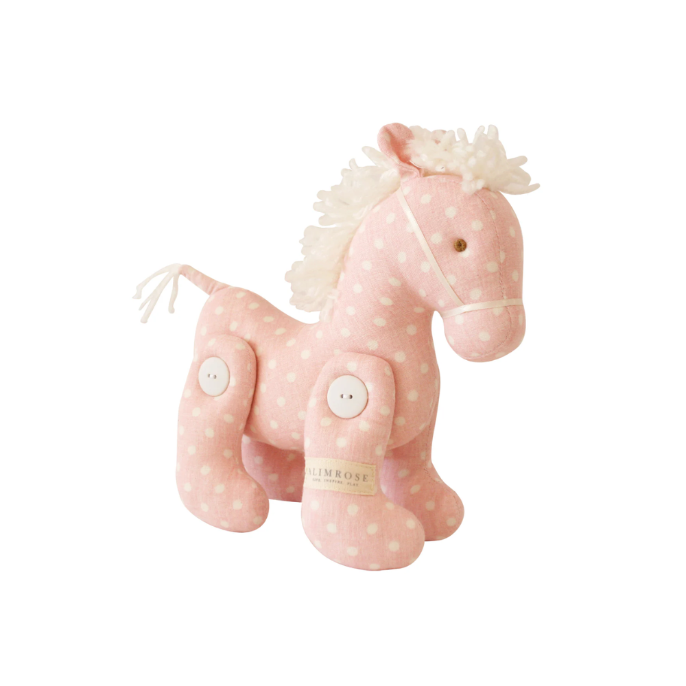 Welcome your little one to the enchanting Jointed Pony by Alimrose - a delightful combination of playful allure and nursery decoration. Made with soft cotton on the outside, this pony is perfect for tiny hands to cuddle. Its buttoned legs allow for movement, making it even more enjoyable. Adding a whimsical touch to any nursery, this pony features a soft yarn mane and a pink-and-white or blue and white spotted fabric. It can also transition from a decorative piece to a cherished companion, suitable for children 3 years and older. Standing at 8.7" tall, this pony adds a touch of elegance to your nursery.