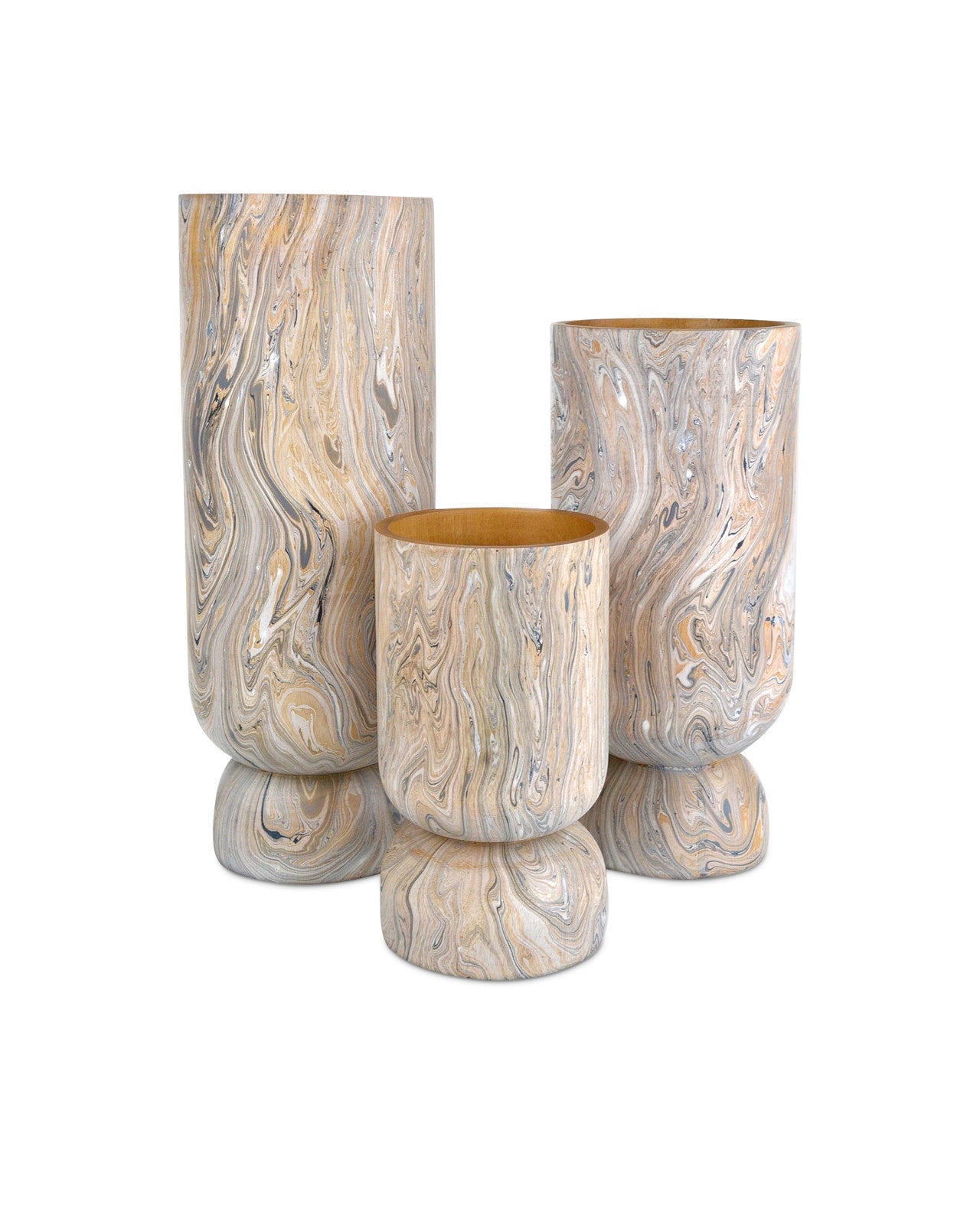 Made of wood, the London Sky Vase Set includes three gray and peach vases with swirling patterns along their surfaces, which have been hand-painted for a marbleized effect. The neutral tones of tan, peach, white, and gray bring these tan decorative accessories a textural feel. The patterning on these multicolored vases will make them dynamic elements in a room.
