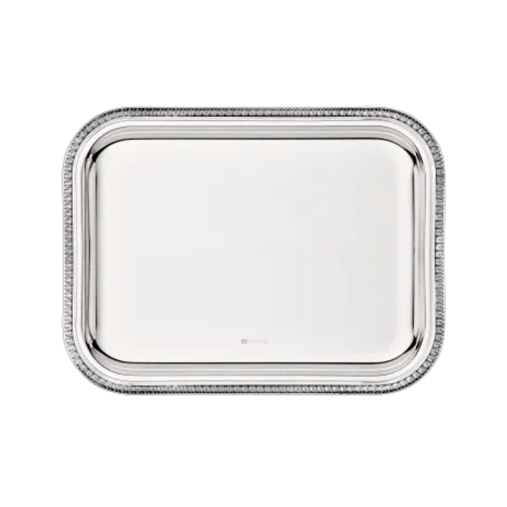 This small silver-plated rectangular tray in the Malmaison pattern can be used for presentation or serving. One of Christofle's most historic patterns, Malmaison typifies the Empire style, with its frieze of delicate palm and lotus leaves and symmetrical design. The name is a nod to the Chateau de la Malmaison, a favored Parisian residence of Napoleon Bonaparte and Empress Josephine.