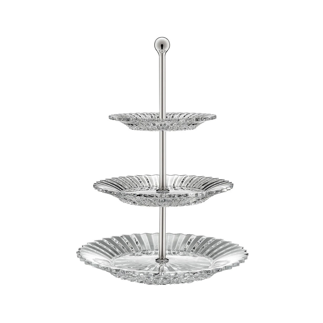 The Mille Nuits three-level pastry stand is a charming centerpiece. The decorative crystal plates and the varnished silver-plated metal stand are both elegant and functional. The lines irradiating from the plate’s center highlight the prismatic possibilities of the Baccarat crystal.