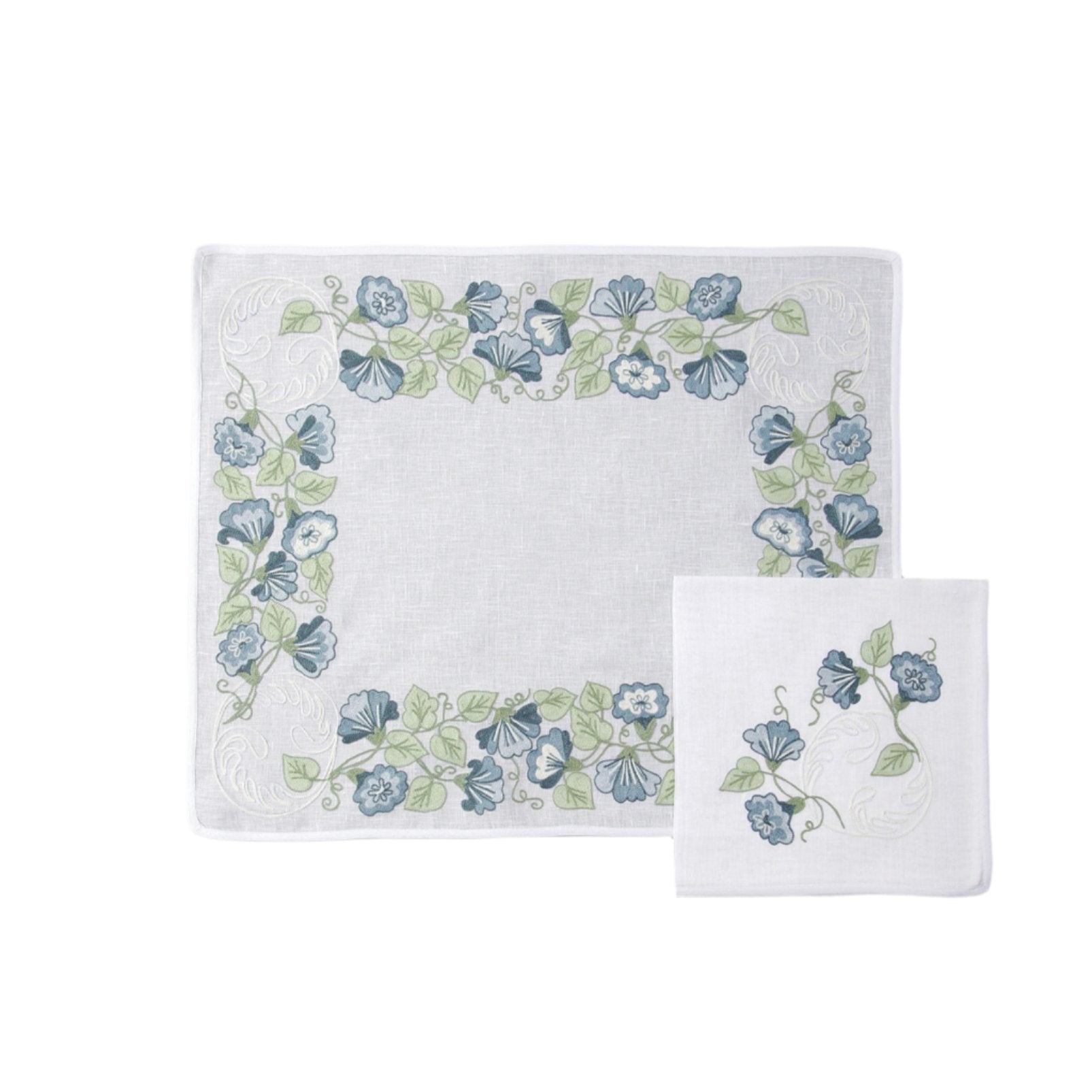 Experience the beauty of morning glory flowers with this 100% linen placemat and napkin set. Hand embroidered to add an elegant touch, these pieces are perfect for elevating any morning meal.