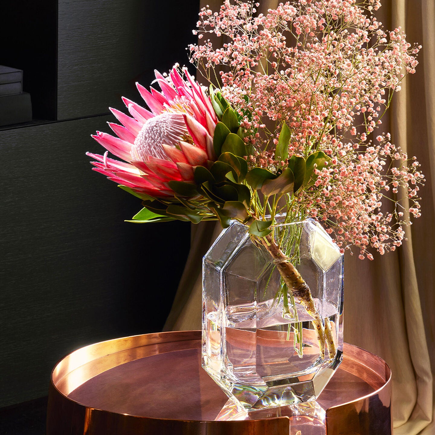 The signature of all Baccarat chandeliers, the octagonal tassel is here transformed into a vase. The clear-cut lines, corners and roundness are combined to reflect the light. Like a delicately cut precious stone, the Octagonal vase is a true gem to embellish every ambiance. A brilliant piece to illuminate the finest bouquets.