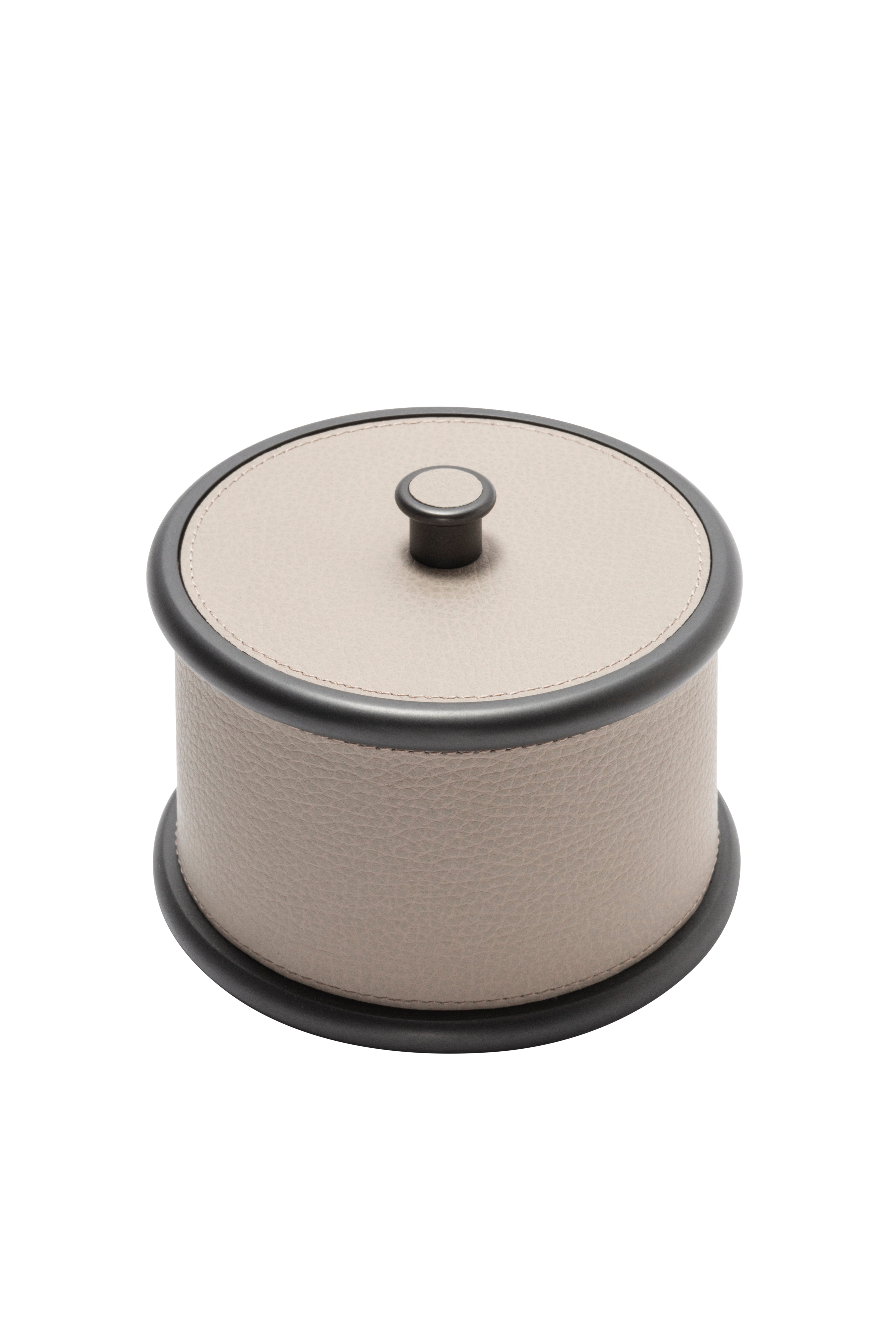 The Ravello Bath Collection exemplifies refined minimalism with its striking cylindrical form softened by gracefully rounded edges. Crafted from partially leather-covered metal, this piece marries Italian craftsmanship with contemporary design. Choose from polished chrome, brushed bronze, or brushed brass finishes to complement your aesthetic. The supple leather exterior provides tactile warmth, while a non-slip waterproof rubber base ensures stability on any bathroom surface. A sophisticated addition to discerning interiors. Contact us for choices of leathers and finishes; prices may vary. Dia 4.7" x H 3.9"