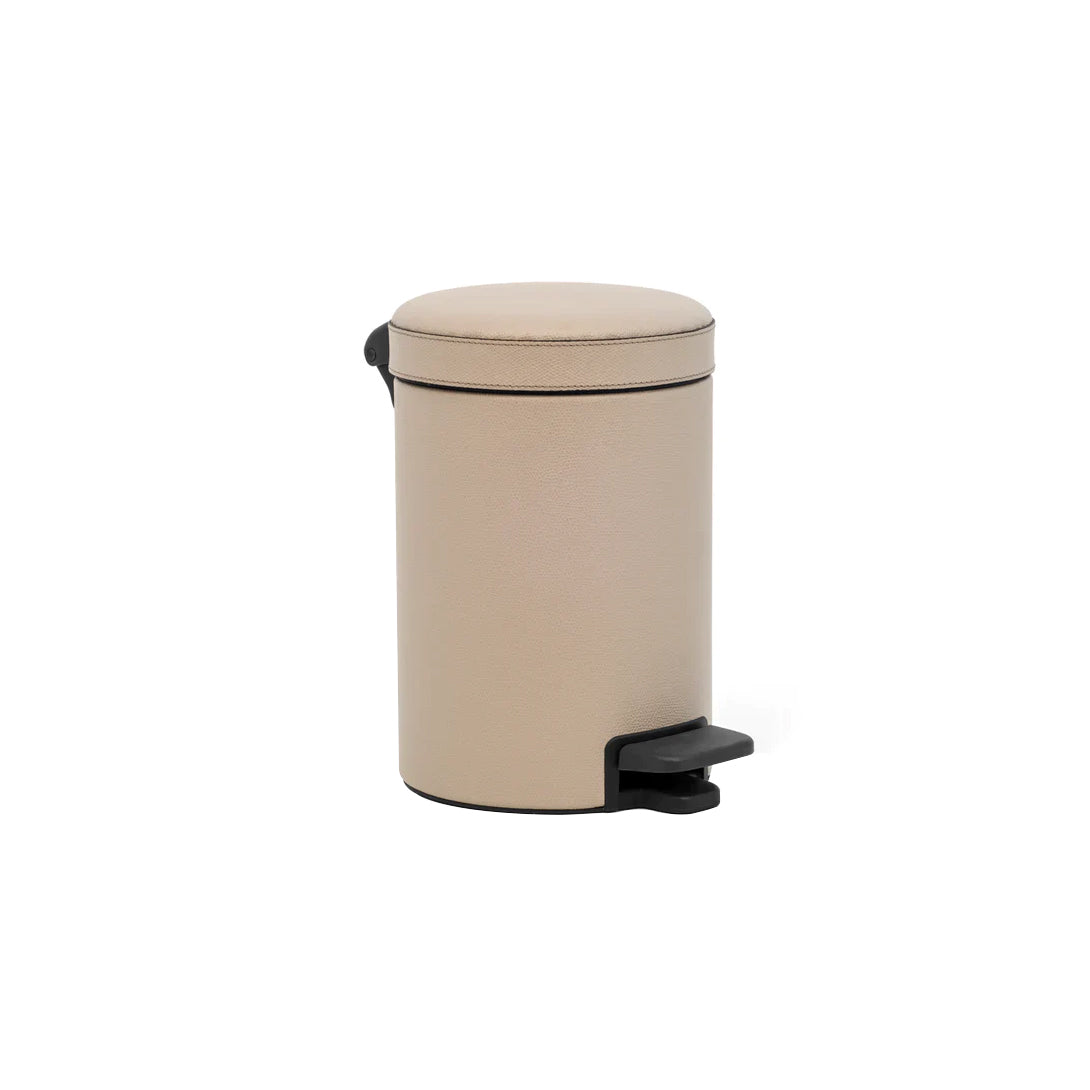 A chic and sleek aesthetic for this wastebasket with a black pedal. Available with a 3 and 5 liter capacity and a soft closing function that will avoid any loud noises. Finished in neutral tone leather to perfectly match with an array of bathroom décor styles.